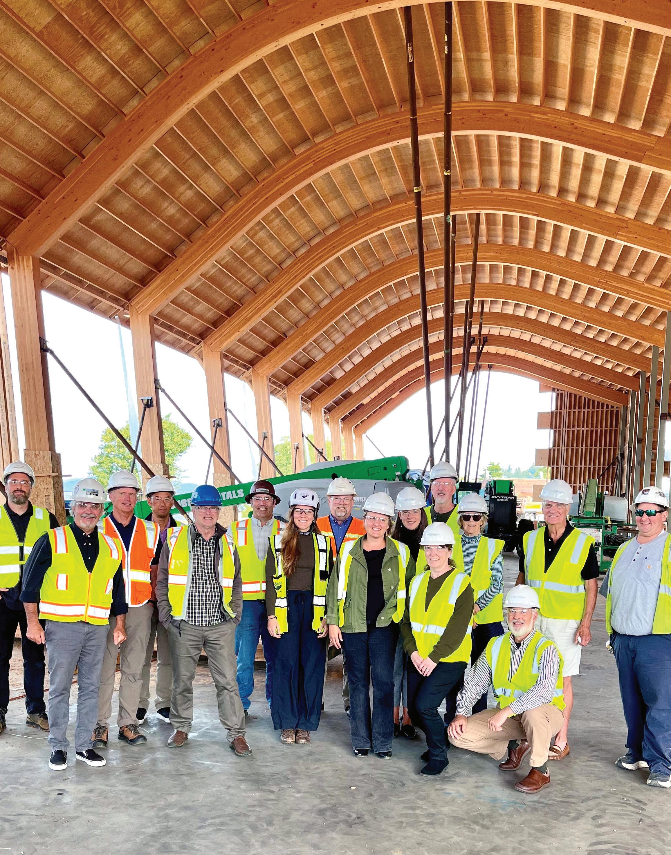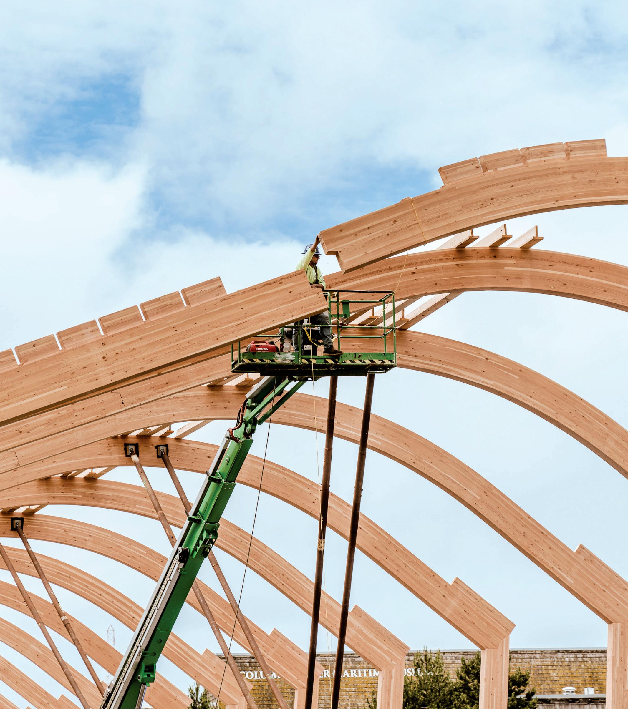 CRMM’s transformative Mariners Hall project is moving smartly ahead with the completion of a new parking lot around the Barbey Maritime Center, and the erection of the steel and timber beams, timber roof, and shear walls on the 24,500 square foot Warnock Building.