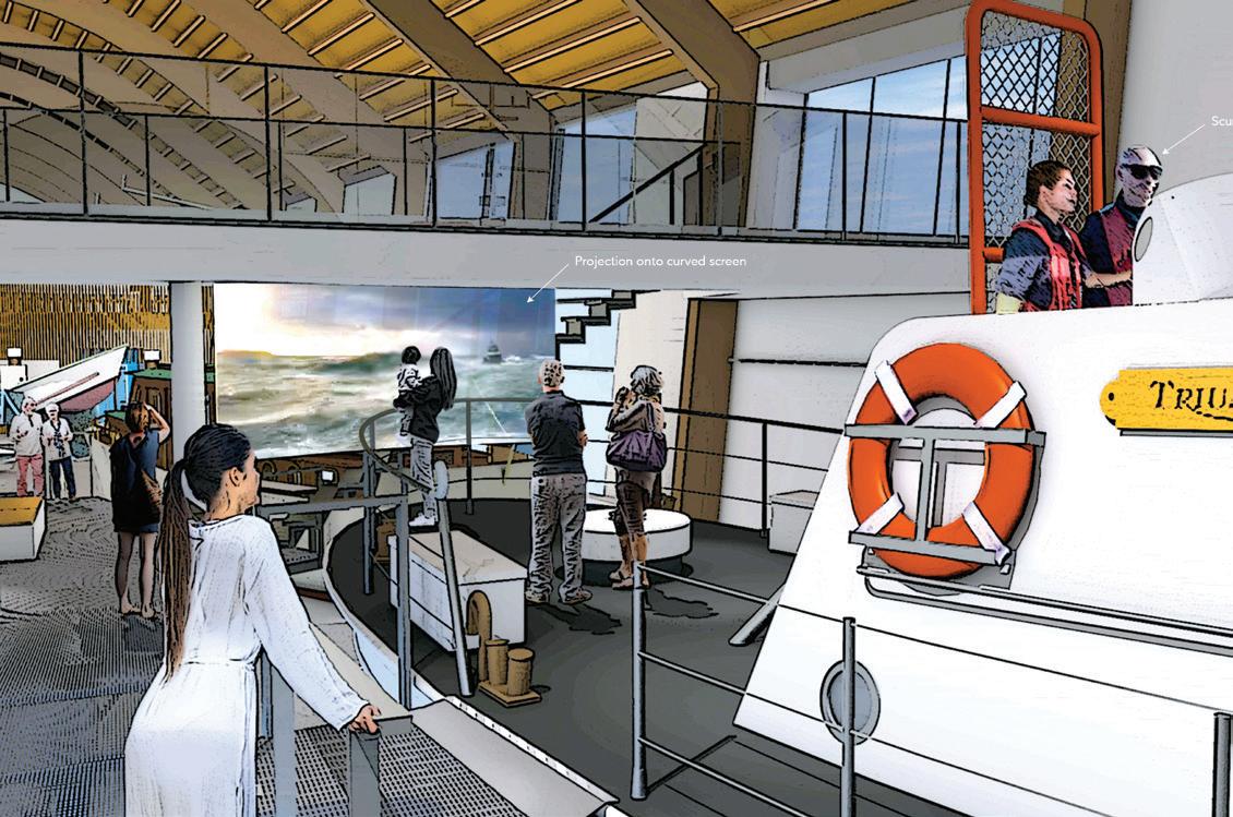 Professional painter Alicia Palmer (right) and volunteers Lloyd Bowler and Doug Taylor along with Susan Hinton (not shown) did a marvelous job restoring Triumph II’s paint at the Port of Astoria prior to her ride through downtown to the Museum. Workers carefully position the cradle underneath Triumph II. Visitors will board Triumph II’s stern from a walkway. From there, they will be able to walk her decks, and view a video of heavy seas on the Columbia River Bar filmed from a Coast Guard motor lifeboat. Storyline Studio graphic