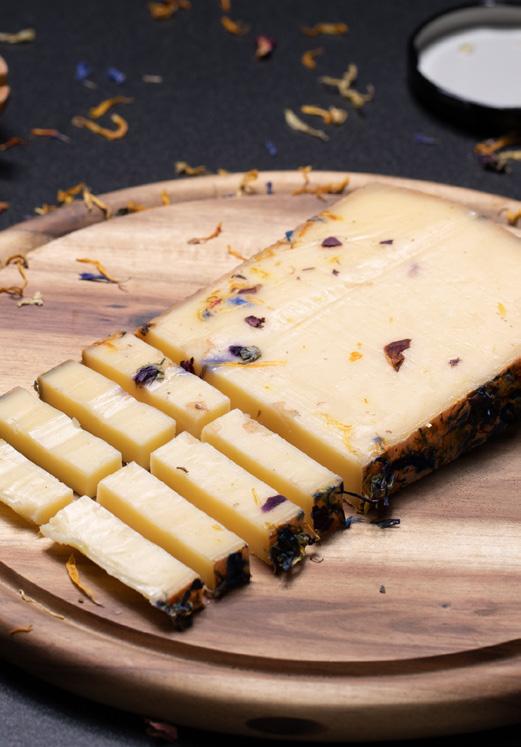 This creamy chevre is adorned with a vibrant coat of dried flowers, including delicate rose petals, vibrant cornflowers, and sunny marigolds. With its herbal and citrus undertones, complemented by fresh grassy notes, this cheese offers a bright, creamy, and herbaceous flavor profile.
