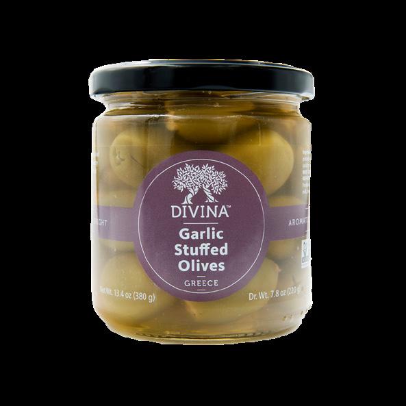Succulent green olives stuffed with delightful complements. Perfect for cheese or charcuterie boards and salads. An incredibly luscious and full-flavored treat.