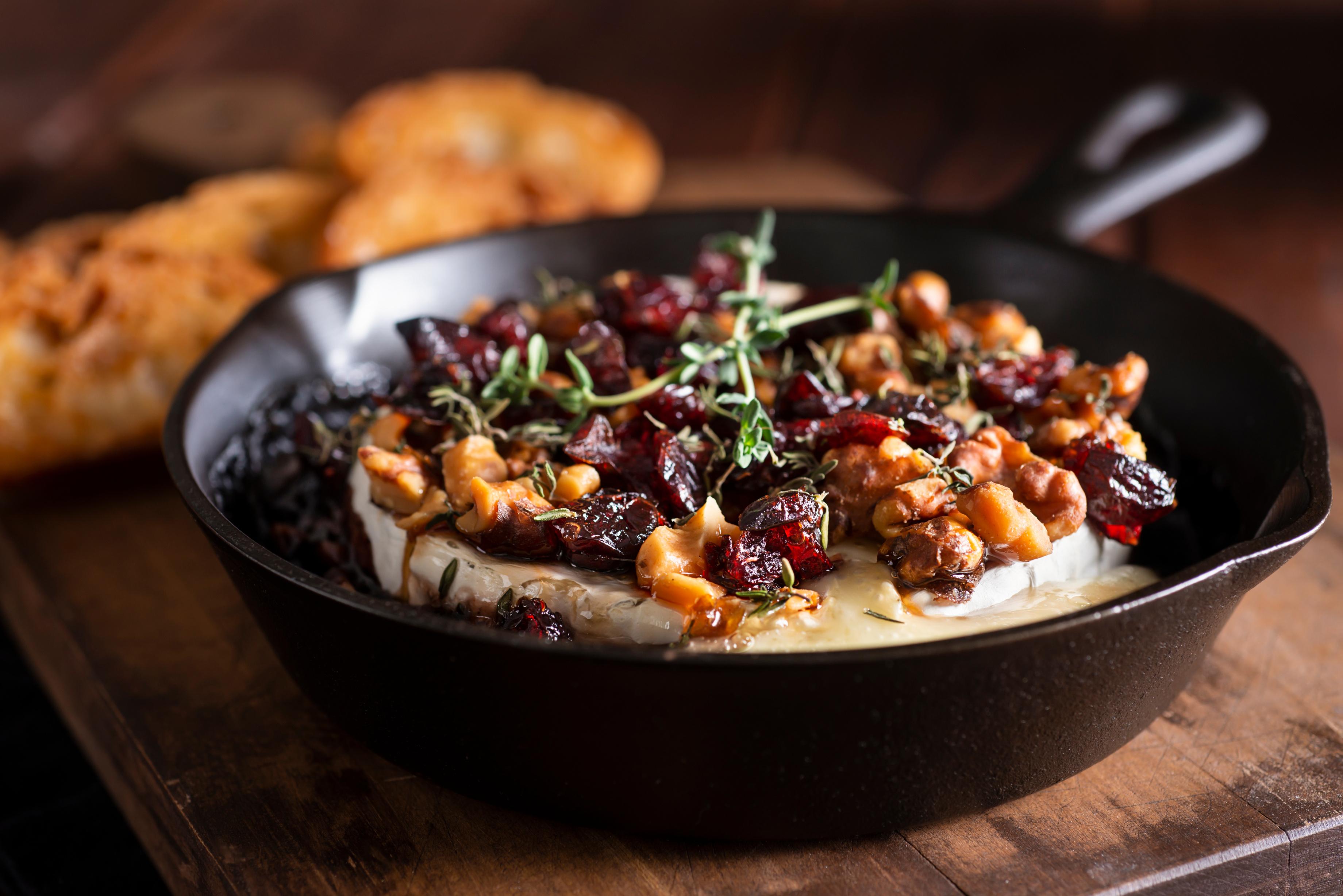 5 Spoon the cranberry and toasted walnut mixture on the top of the Brie wheel Sprinkle on the fresh thyme Let cool for 5 minutes then serve with sliced baguette