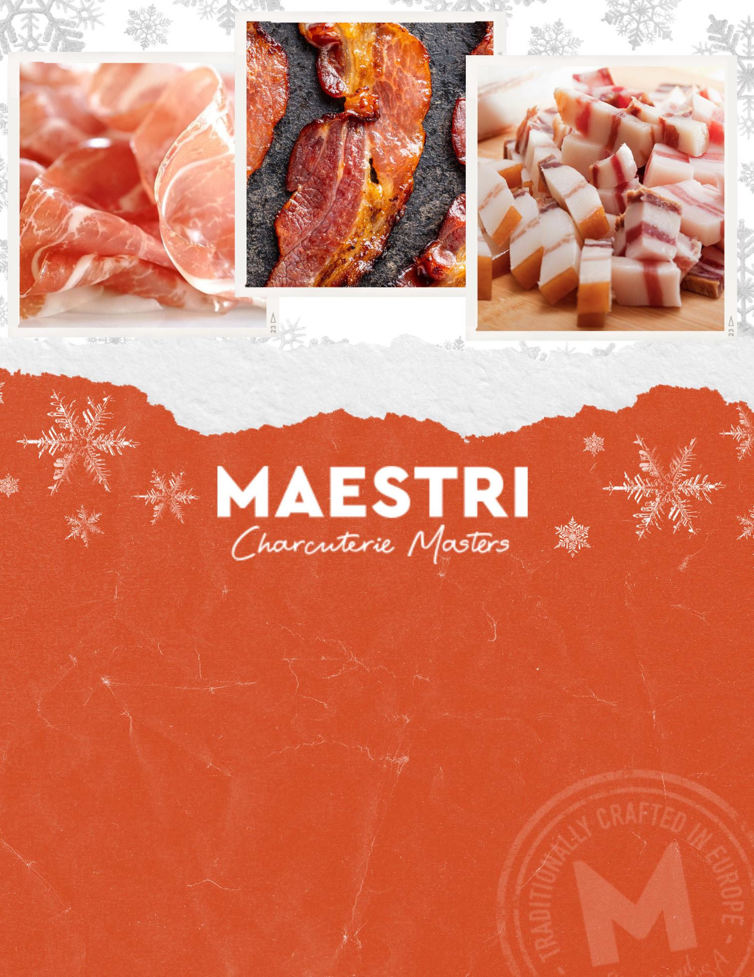 Bacon Italiano Maestri is obtained by selecting fresh cuts of lean bacon. The process involves salting and adding an original mixture of spices and, the result is a tasty cured meat with delicate smoky notes that can be consumed both raw and cooked.