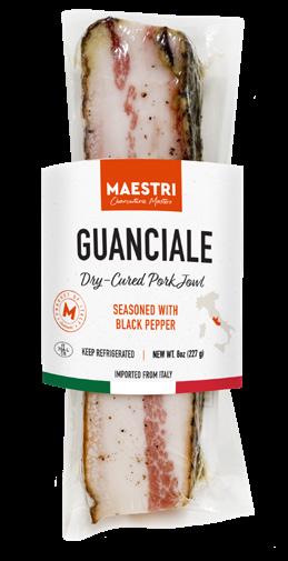 Seasoned with black pepper. Authentic Italian Guanciale is a specialty from the Umbria and Lazio regions, characterized by its tenderness and very special flavor. It is made from first choice pork jowl, then salted, flavored and slow-cured for approximately 3 months.