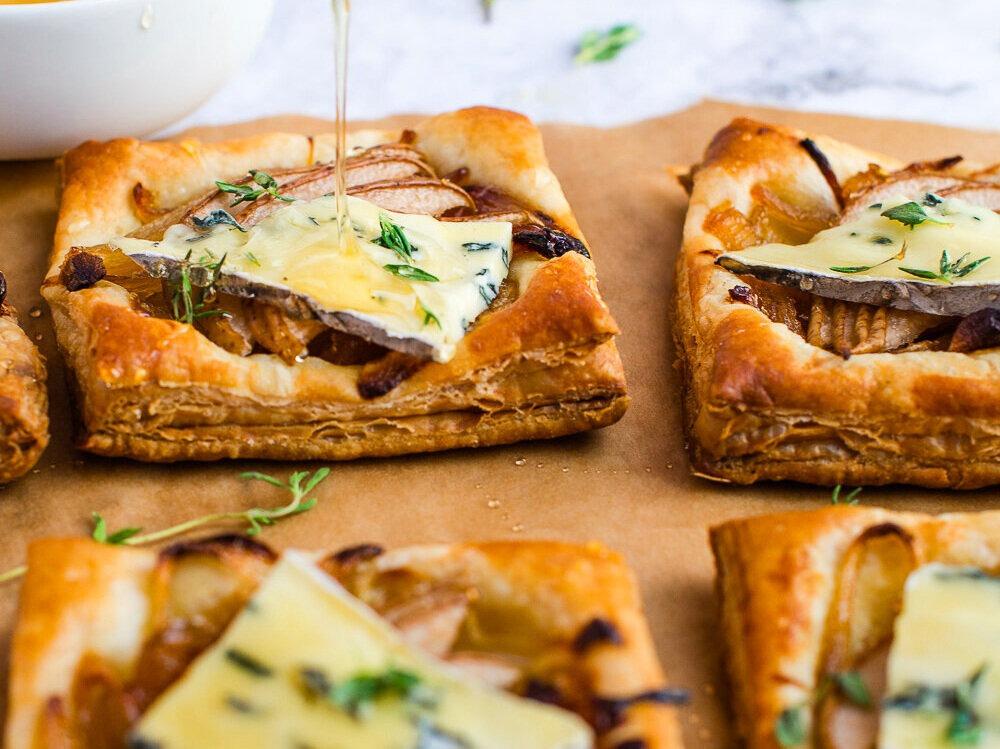 8 Remove tarts from oven and immediately top each one with a slices of CAMBOZOLA Black Label cheese, thyme leaves, a drizzle of honey and a sprinkle of salt Serve immediately.