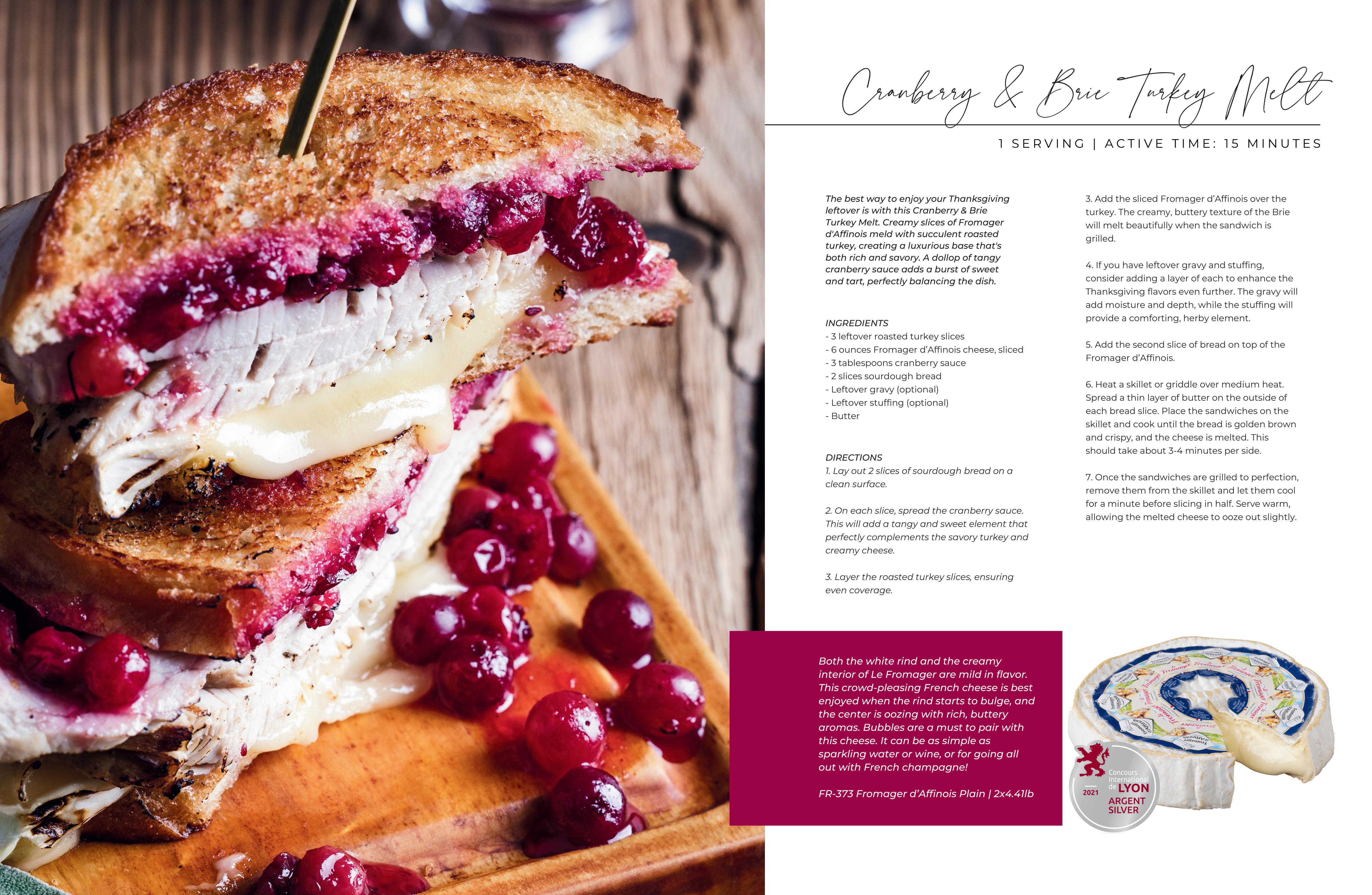 The best way to enjoy your Thanksgiving leftovers! Creamy slices of Fromager d'Affinois meld with roasted turkey, creating a luxurious base that's both rich and savory. A dollop of tangy cranberry sauce adds a burst of sweet and tart, perfectly balancing the dish.