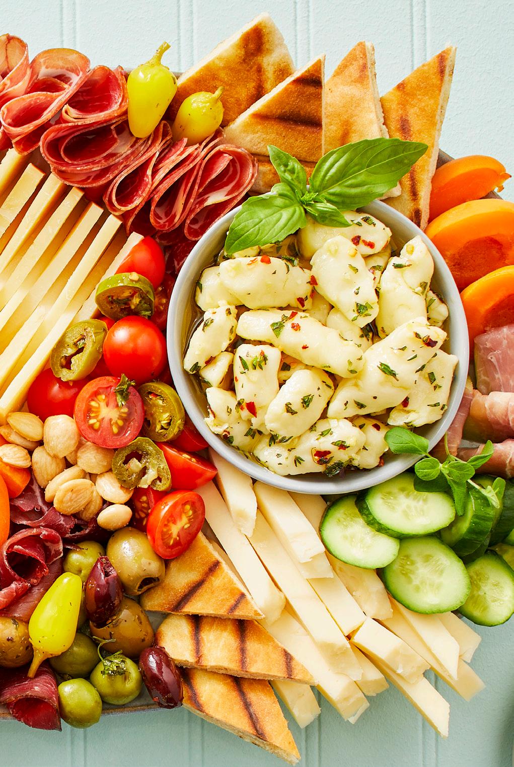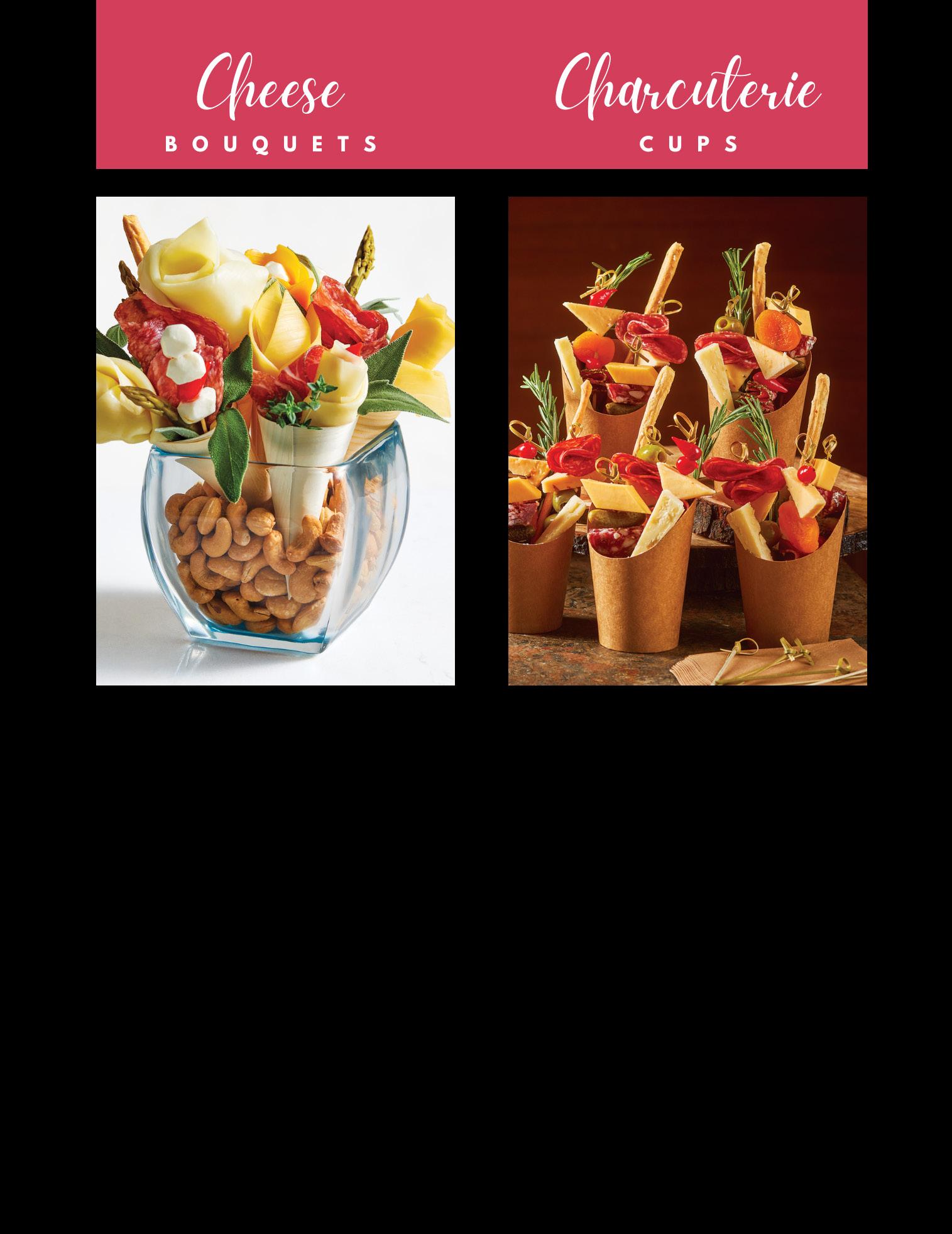 Roll cheeses, charcuterie and radishes into flowers. Thread fresh mozzarella pearls and miniature peppers on toothpicks. Place two to three flowers into each cone. Arrange cones in vases filled with nuts. Fill in bouquets with fresh mozzarella picks, breadsticks and asparagus.