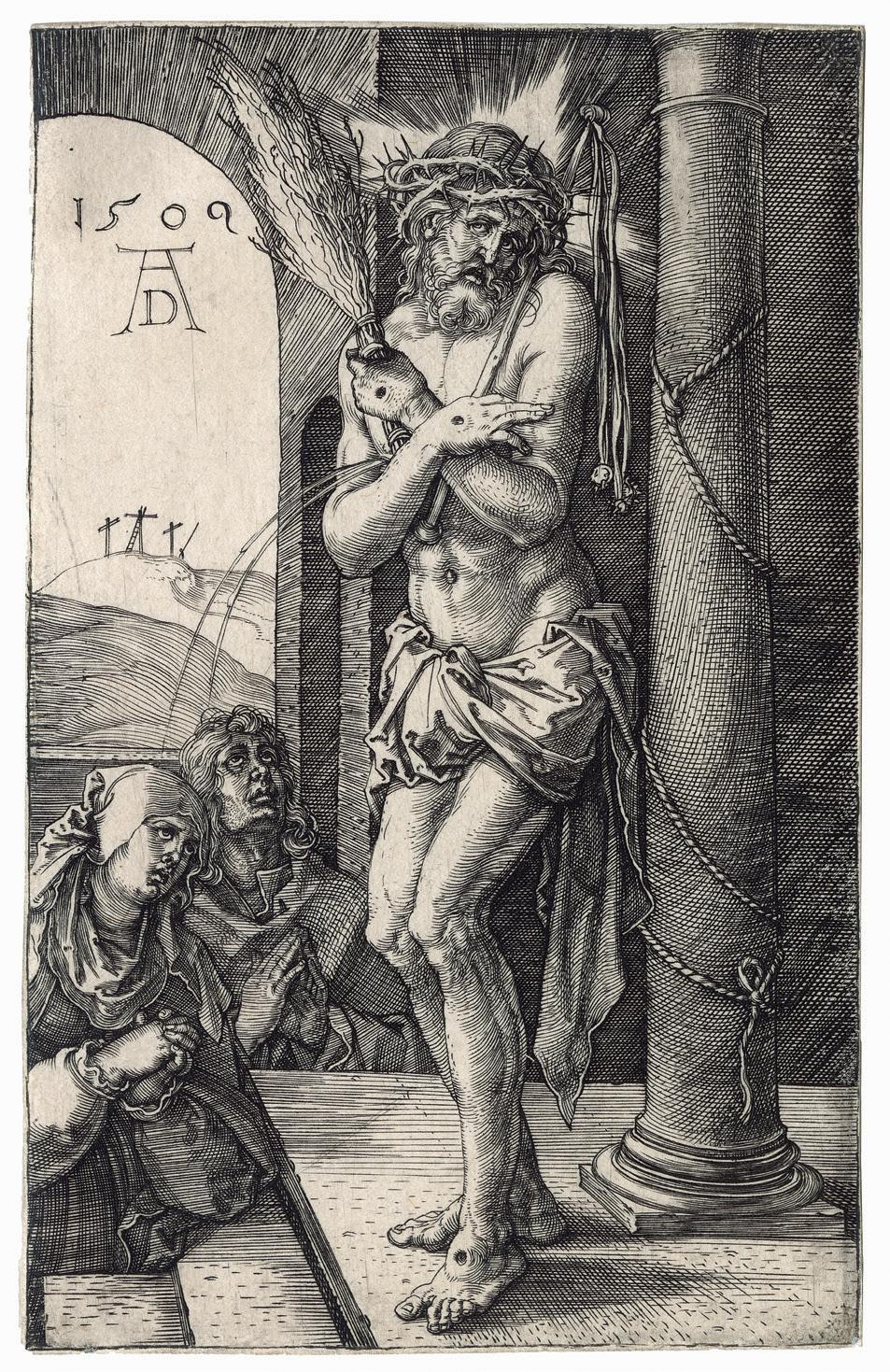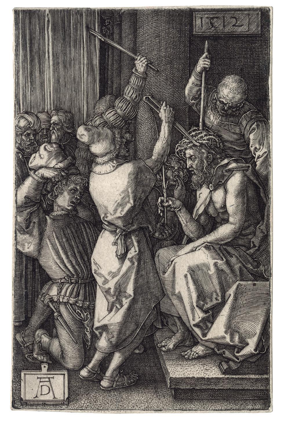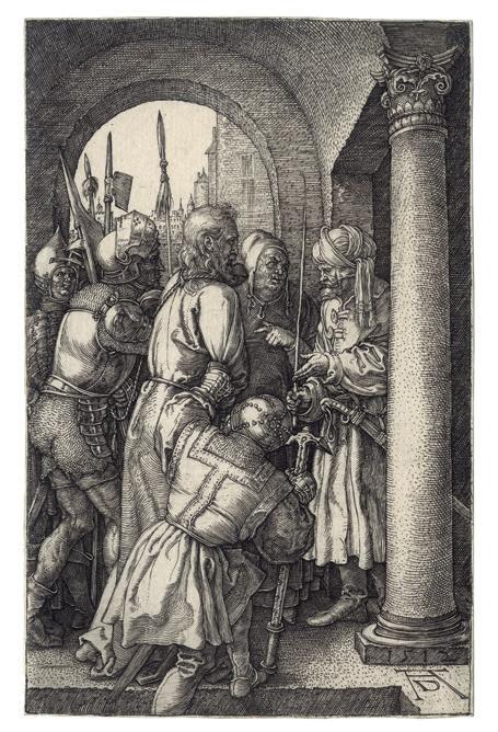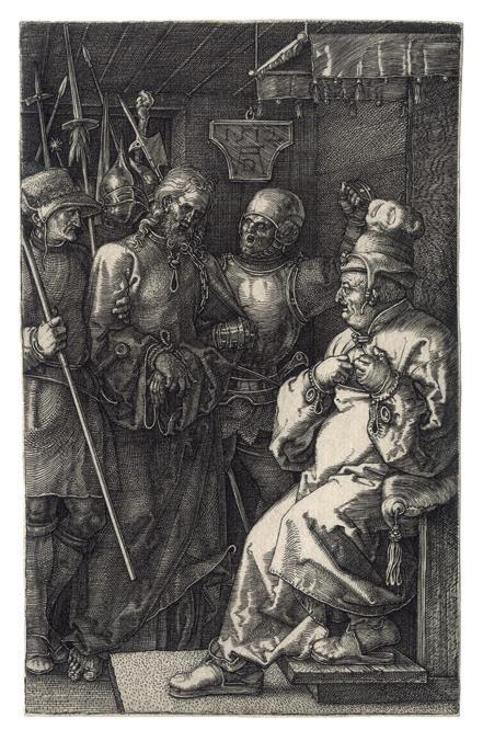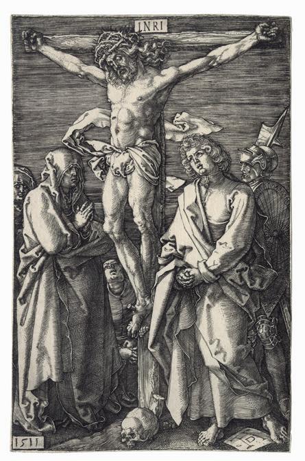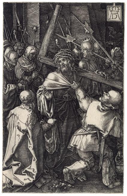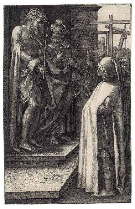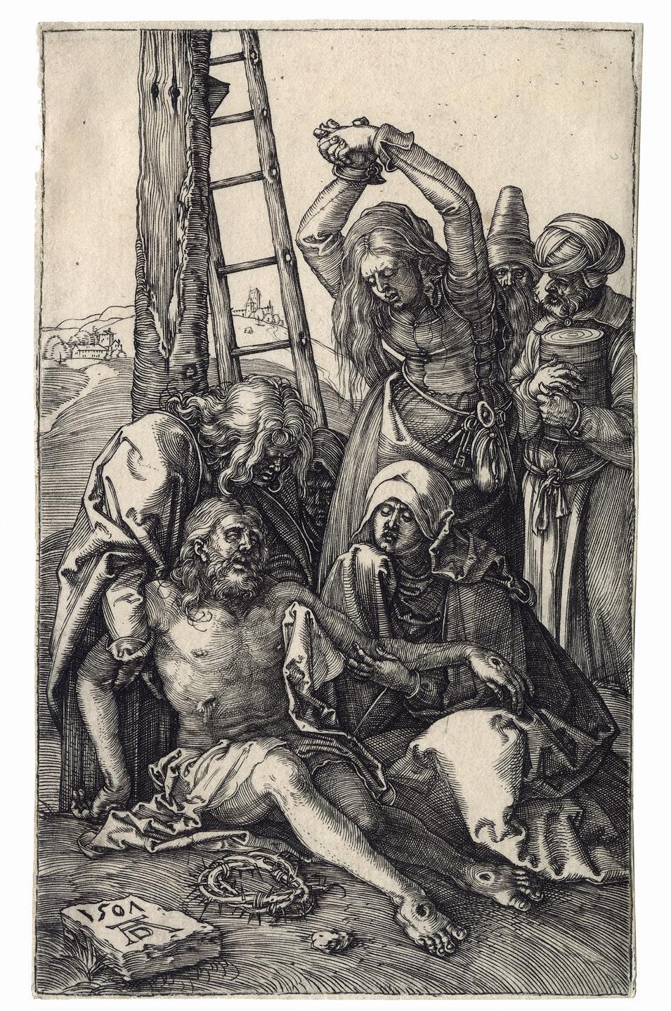 The Engraved passion scenes have a compelling forthrightness and grandeur owing to the prominence of the participants who occupy most of the available space. The consistent placement of the figures in the foreground unifies the series. With the exception of the earliest print, the 1507 Lamentation , Dürer has defined the limits of the shallow space by two devices; either parallel shading lines that depicts darkness or dark-toned architectural backgrounds. In the Deposition of Christ (Meder 15), the rocks behind the figures perform the same function as the architecture. Both shading and architecture often serve as an intermediate tone between the darkest shadows and the highlights created by the blank paper, as brilliantly exemplified in the Ecce Homo plate. This increased tonal range and the shallow space combine to produce an effect of high relief sculpture to the whole set.