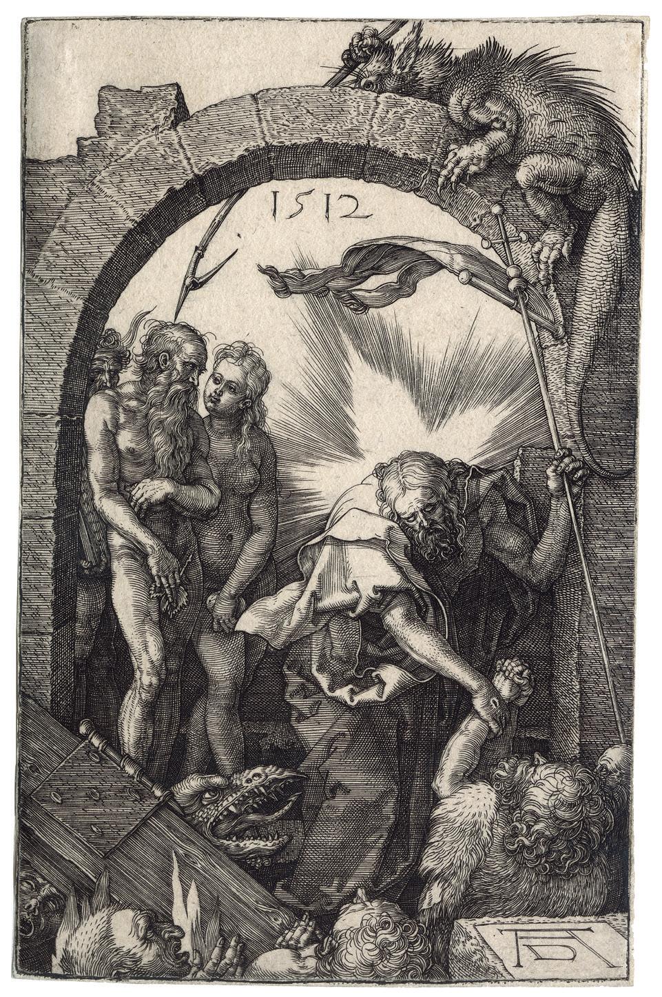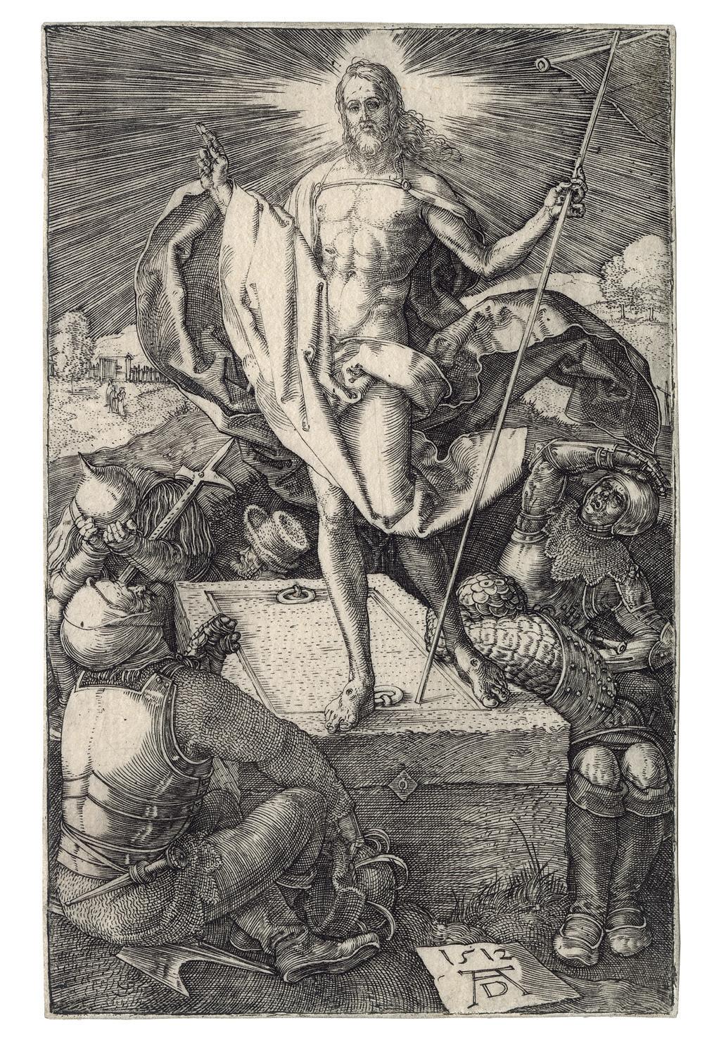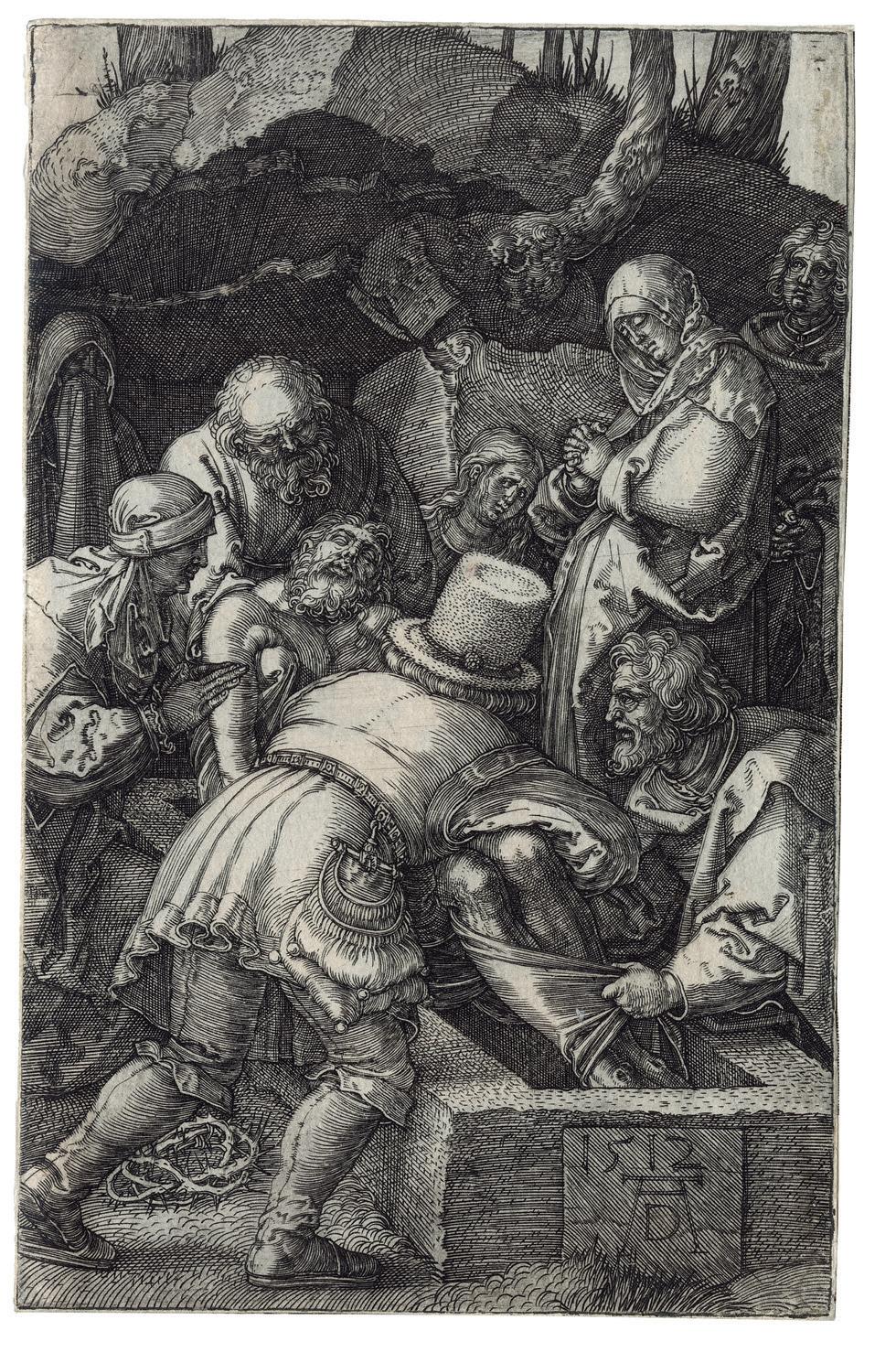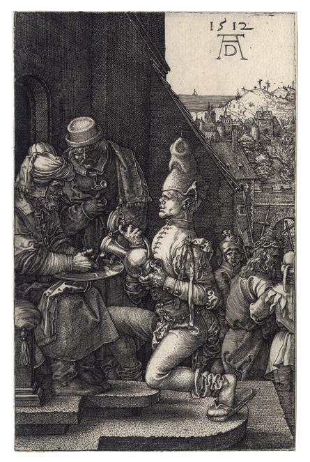 The Engraved passion scenes have a compelling forthrightness and grandeur owing to the prominence of the participants who occupy most of the available space. The consistent placement of the figures in the foreground unifies the series. With the exception of the earliest print, the 1507 Lamentation , Dürer has defined the limits of the shallow space by two devices; either parallel shading lines that depicts darkness or dark-toned architectural backgrounds. In the Deposition of Christ (Meder 15), the rocks behind the figures perform the same function as the architecture. Both shading and architecture often serve as an intermediate tone between the darkest shadows and the highlights created by the blank paper, as brilliantly exemplified in the Ecce Homo plate. This increased tonal range and the shallow space combine to produce an effect of high relief sculpture to the whole set.