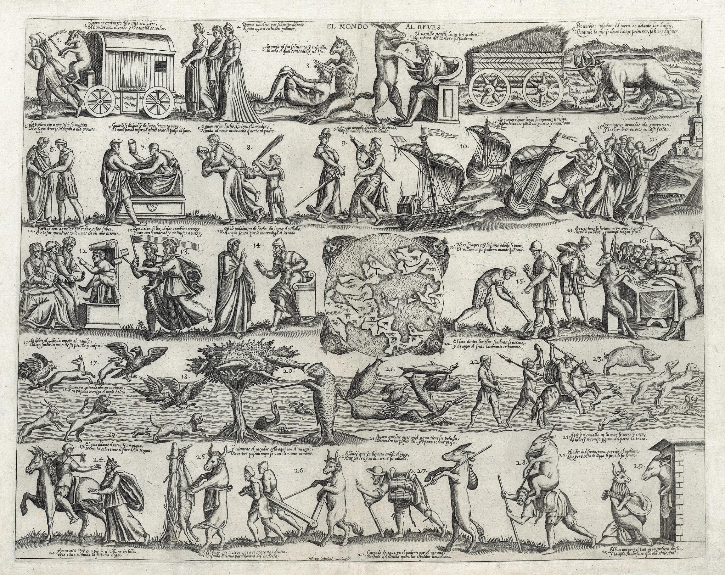 It is an extremely rare plate after the Venetian Niccolò Nelli, intended for the 16th century Spanish market, after his Il Mondo alla Riversa, and perhaps, like other popularthemed tables by Niccolò, inspired by a Cristofano Bertelli’s model. It is made up of twenty-nine vignettes without frame distributed in five registers and in a boustrophedon order, each with two lines of comments in Castilian. It is difficult to set the exact publication date, but it is printed on a very nice laid paper, most likely late 16th century made, with an unidentified watermark. The quality of the etching is very good, and it should be then the work of an accomplished printmaker.