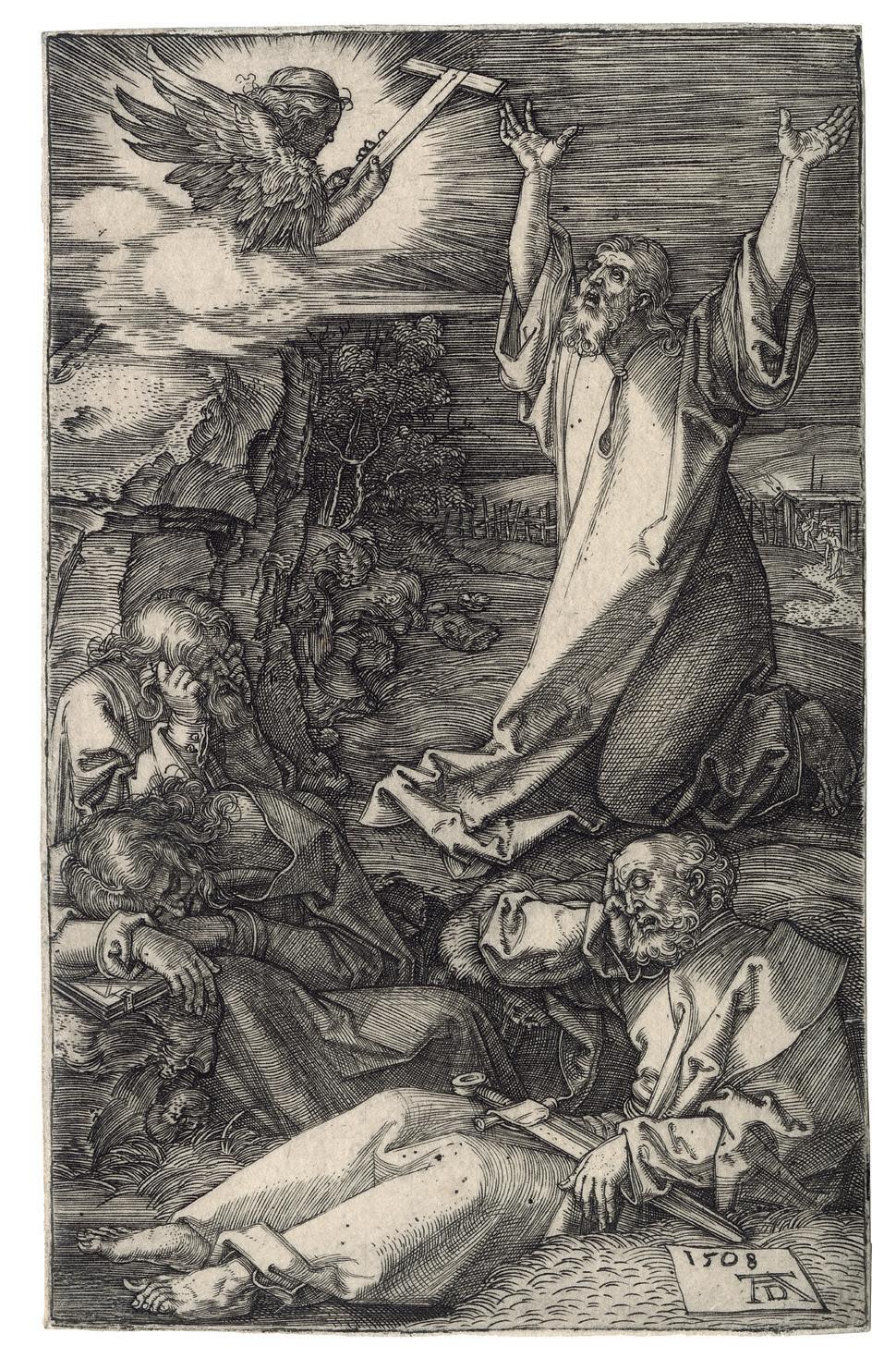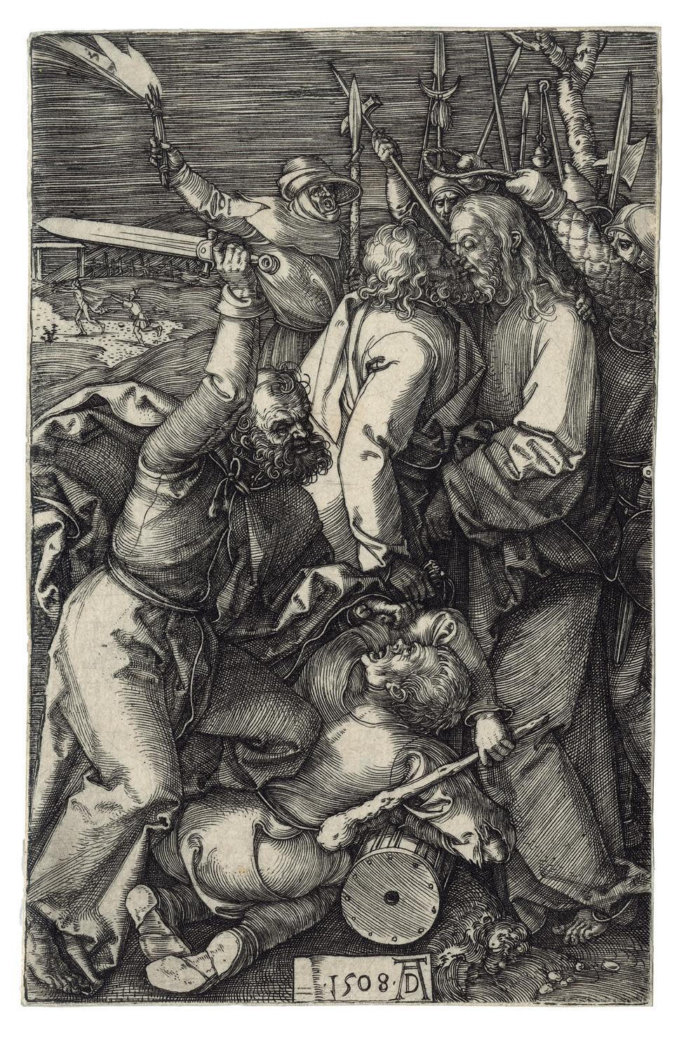 Of the sixteen plates comprising this series, five were engraved between 1507 and 1511, and the remaining ten in 1512. The most likely reason for Dürer’s delay in completing the Engraved Passion is that he was engaged in the preparation of the three large woodcut books (Apocalypse, Large Passion, and Life of the Virgin) and the woodcut Small Passion, published in 1511. What is prodigious is that Dürer maintained himself for so many years at the same high-end quality and that the entire suite presents the same perfection everywhere. Dürer seeks out difficult problems, extreme foreshortenings, details of heads and