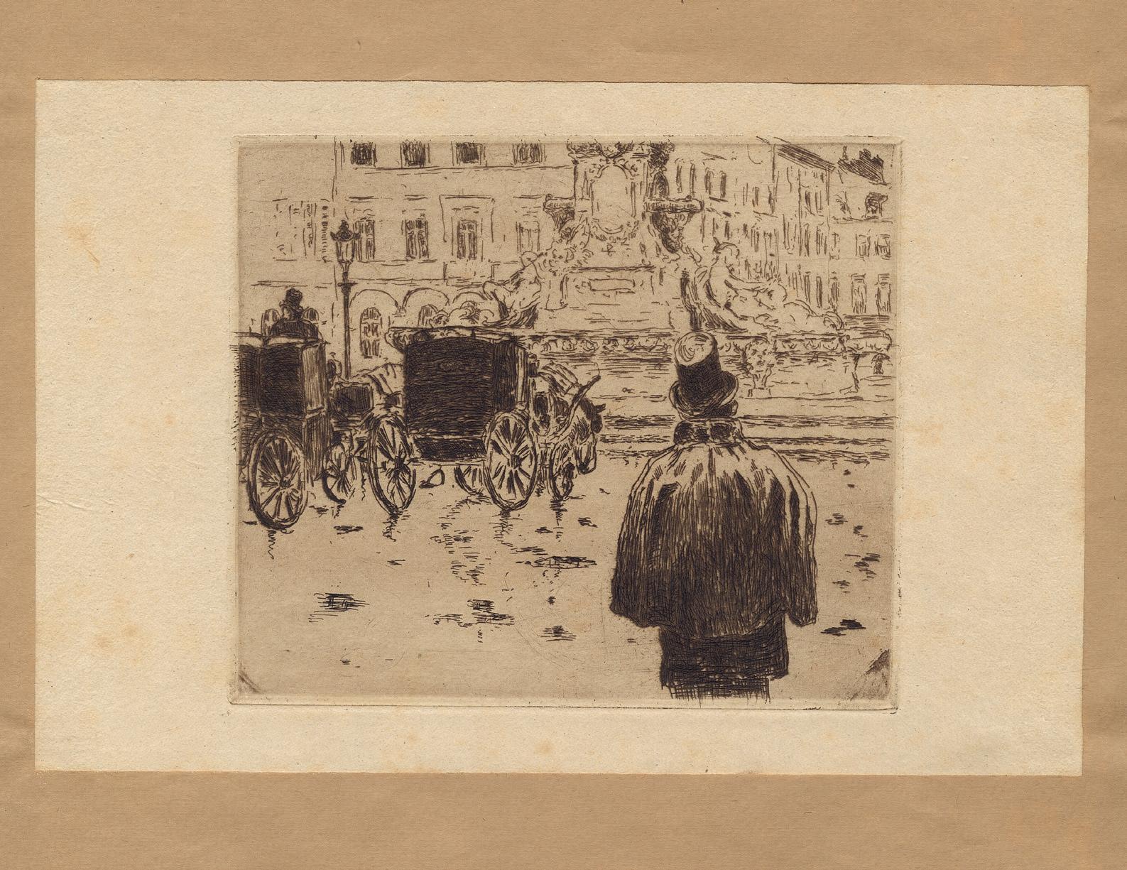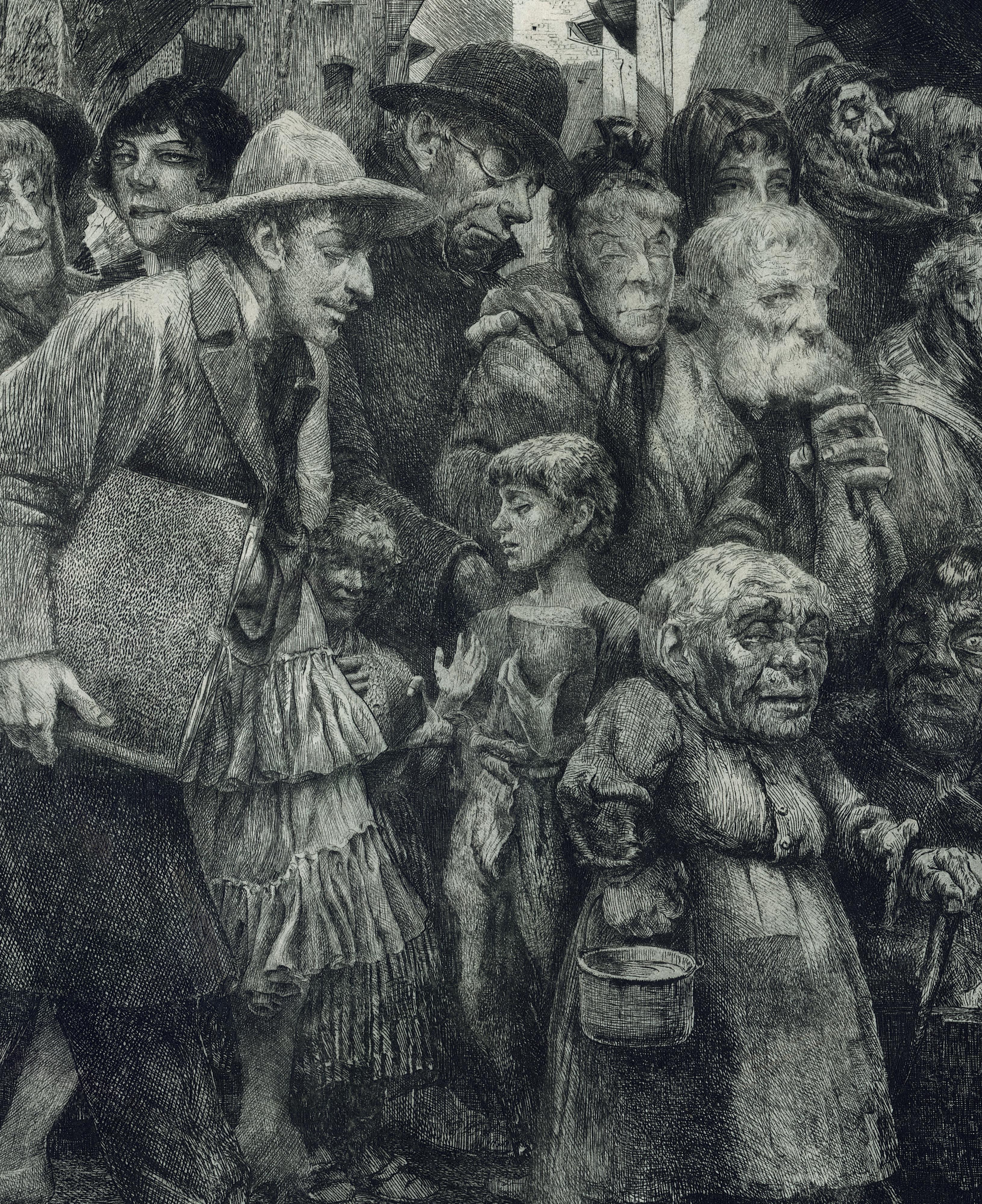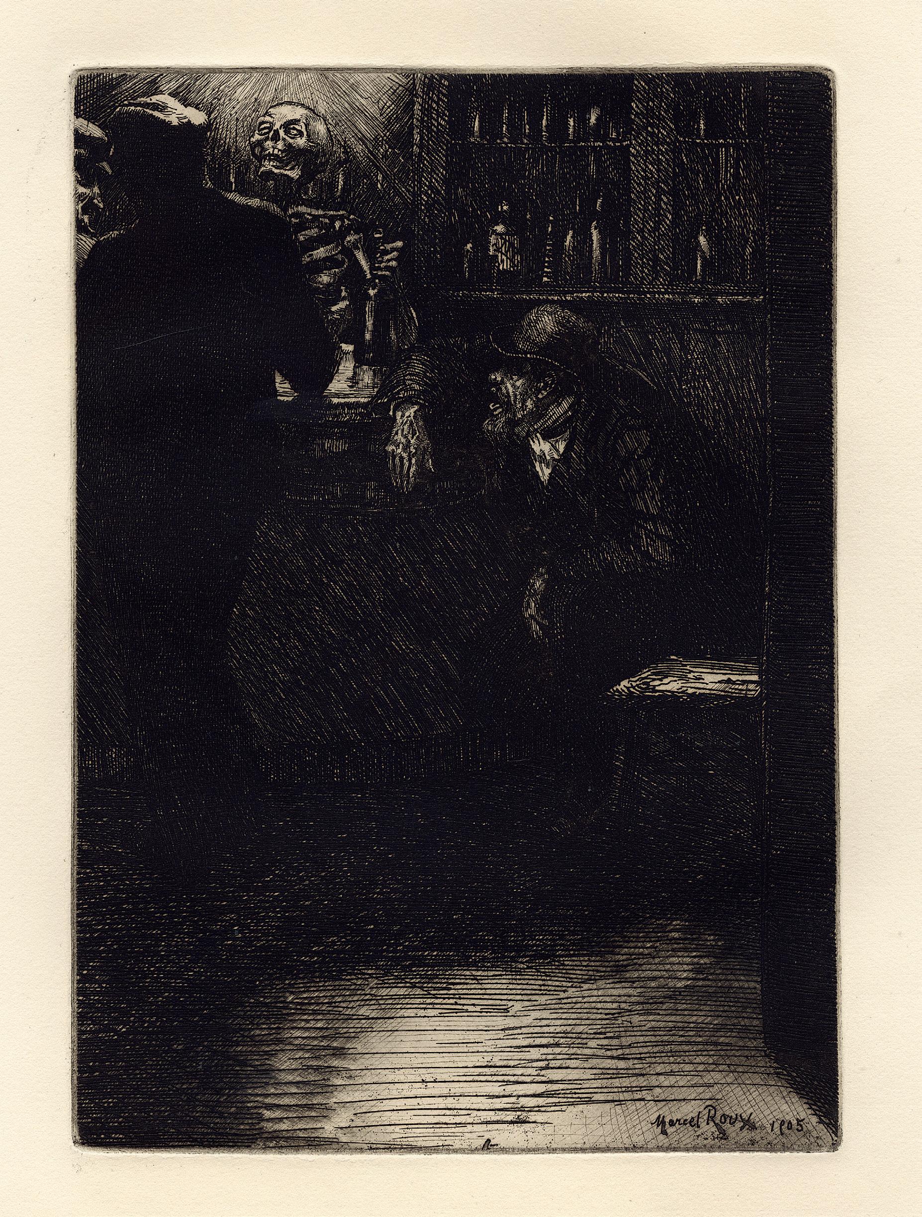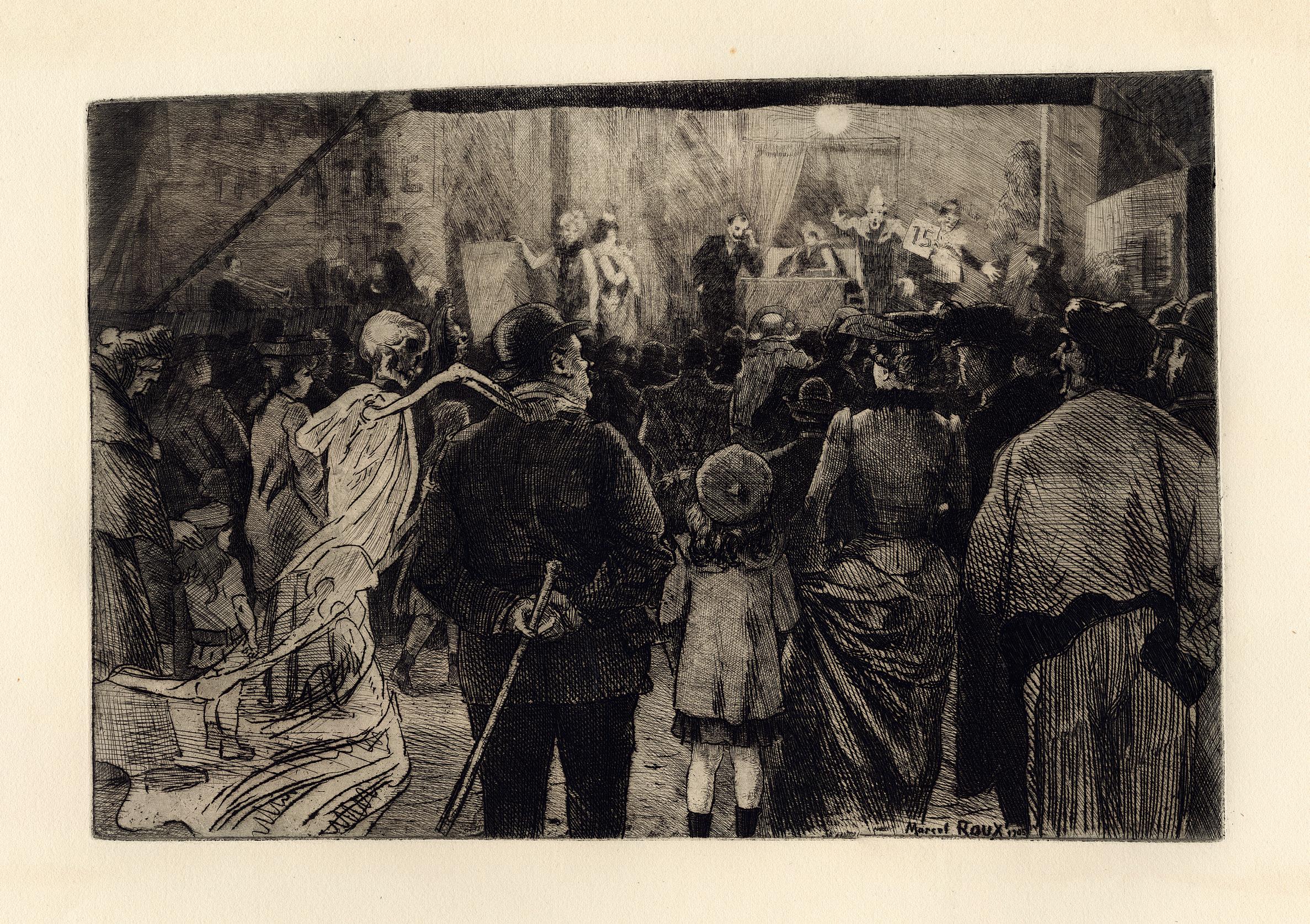 On the back of this print’s frame, there was an original inscription written by the artist, who described the present plate when cataloguing his œuvre in 1949. In this note, the artist identified different characters illustrated as an allegory. From left to right, we can see: The Fanatic, Three bigots, Sad Maternity, The Shadow Man, The Ignorant, two Prostitutes, The Artist, Painful Childhood, The Decayed, The Widow, The Wise Man, The Jew and other figures, the Drunkard, the unhappy Monsters, and the stray Dog. Represented next to each other, creating a compact mass, the artist walks among them with a smile on his face. This beautiful impression, with intense blacks, shows us the overall anguish and dark image of this world of misfits.