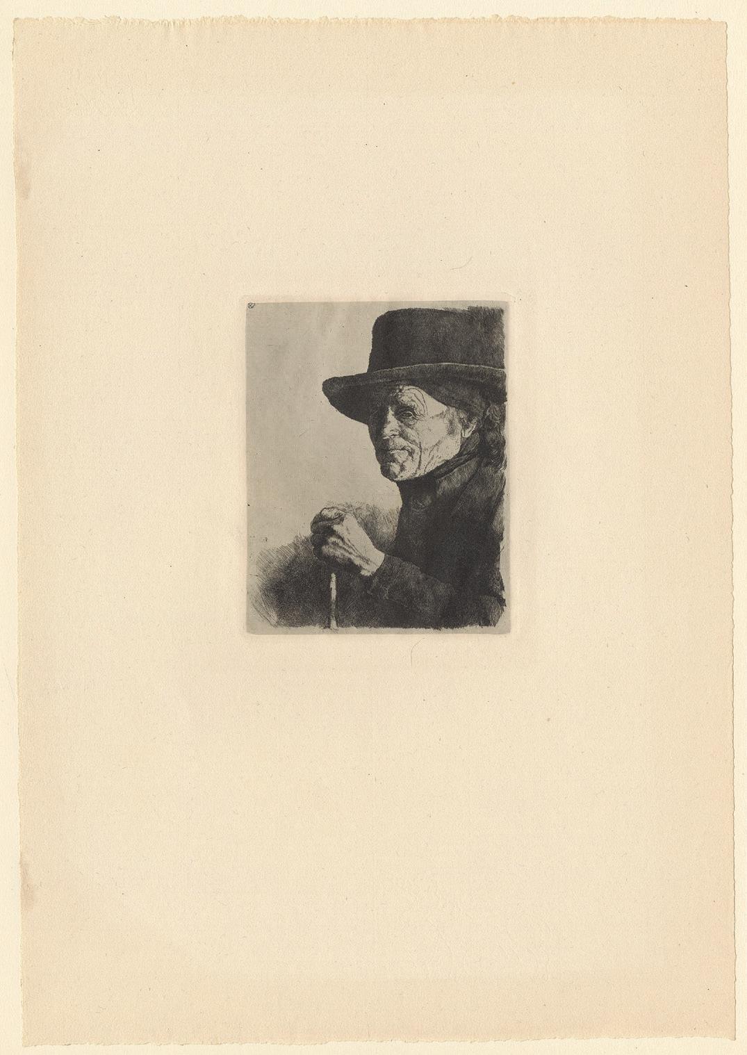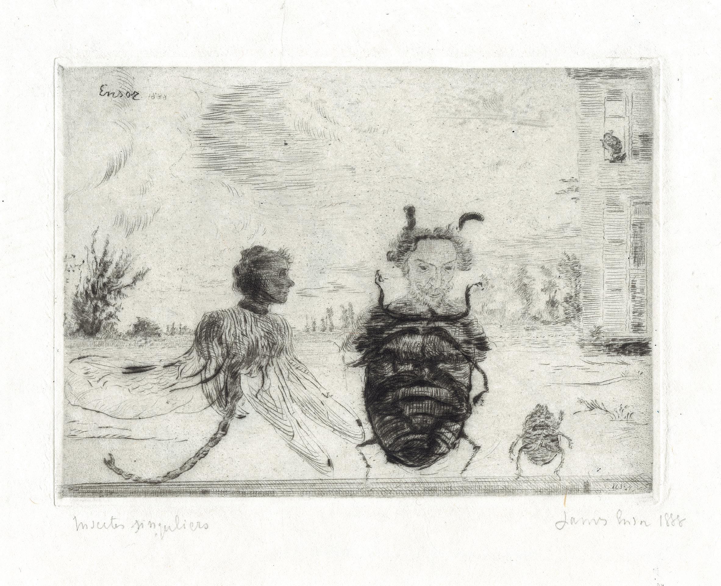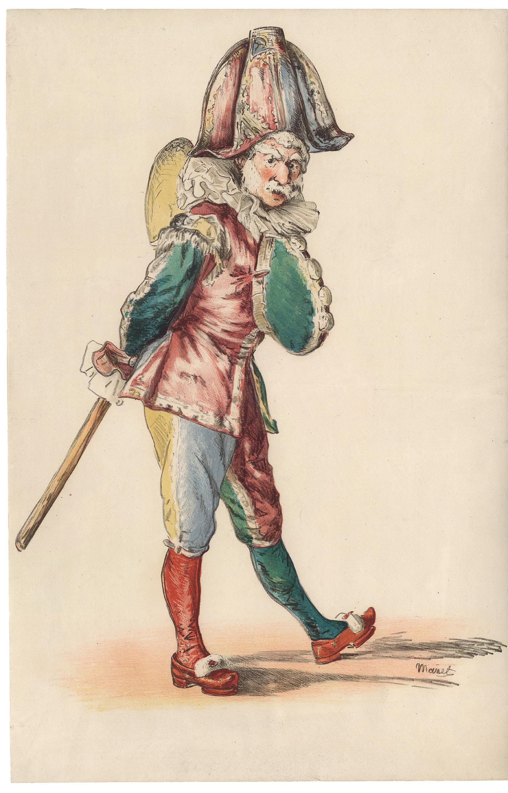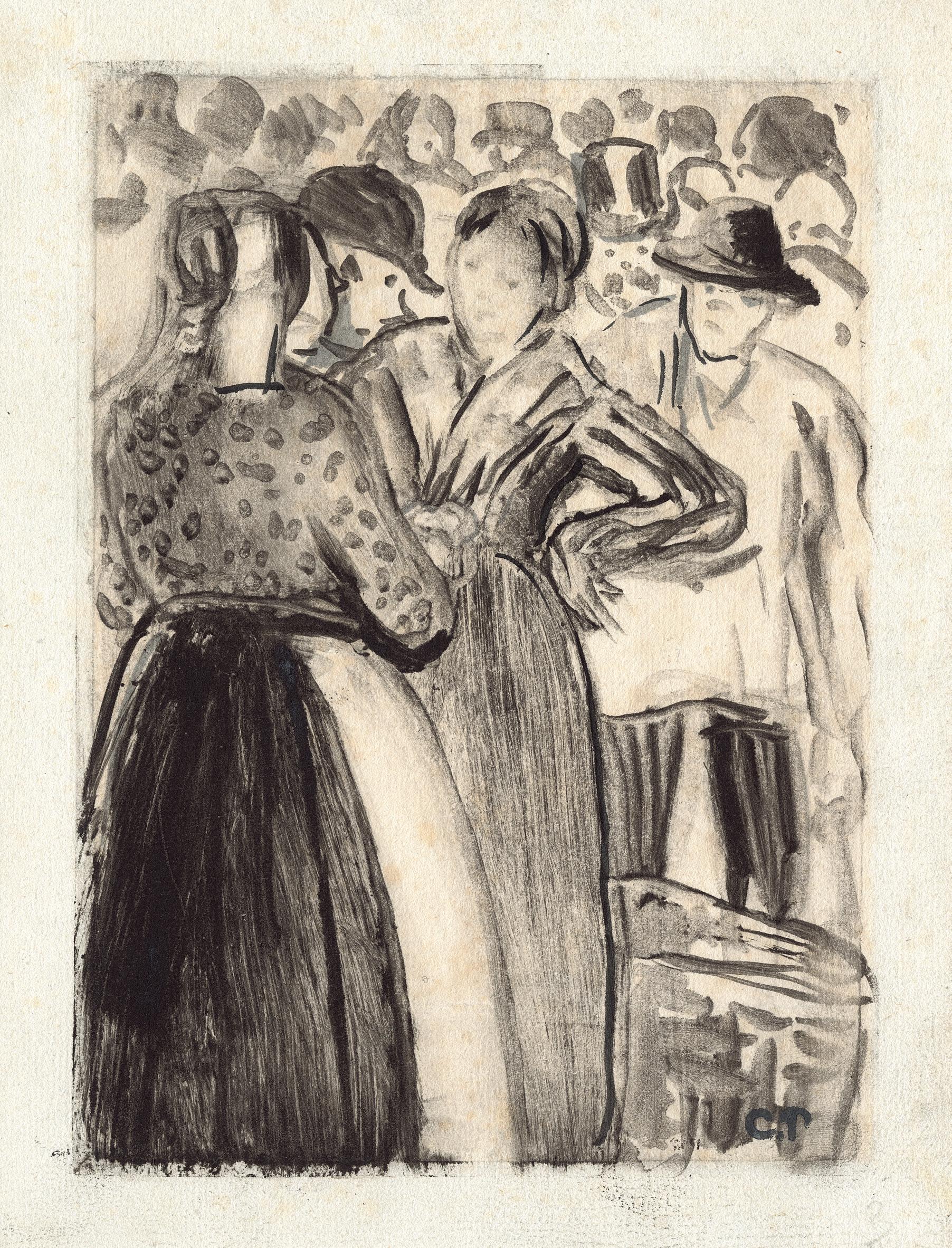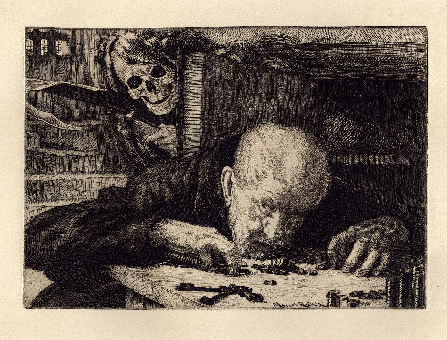 On the back of this print’s frame, there was an original inscription written by the artist, who described the present plate when cataloguing his œuvre in 1949. In this note, the artist identified different characters illustrated as an allegory. From left to right, we can see: The Fanatic, Three bigots, Sad Maternity, The Shadow Man, The Ignorant, two Prostitutes, The Artist, Painful Childhood, The Decayed, The Widow, The Wise Man, The Jew and other figures, the Drunkard, the unhappy Monsters, and the stray Dog. Represented next to each other, creating a compact mass, the artist walks among them with a smile on his face. This beautiful impression, with intense blacks, shows us the overall anguish and dark image of this world of misfits.
