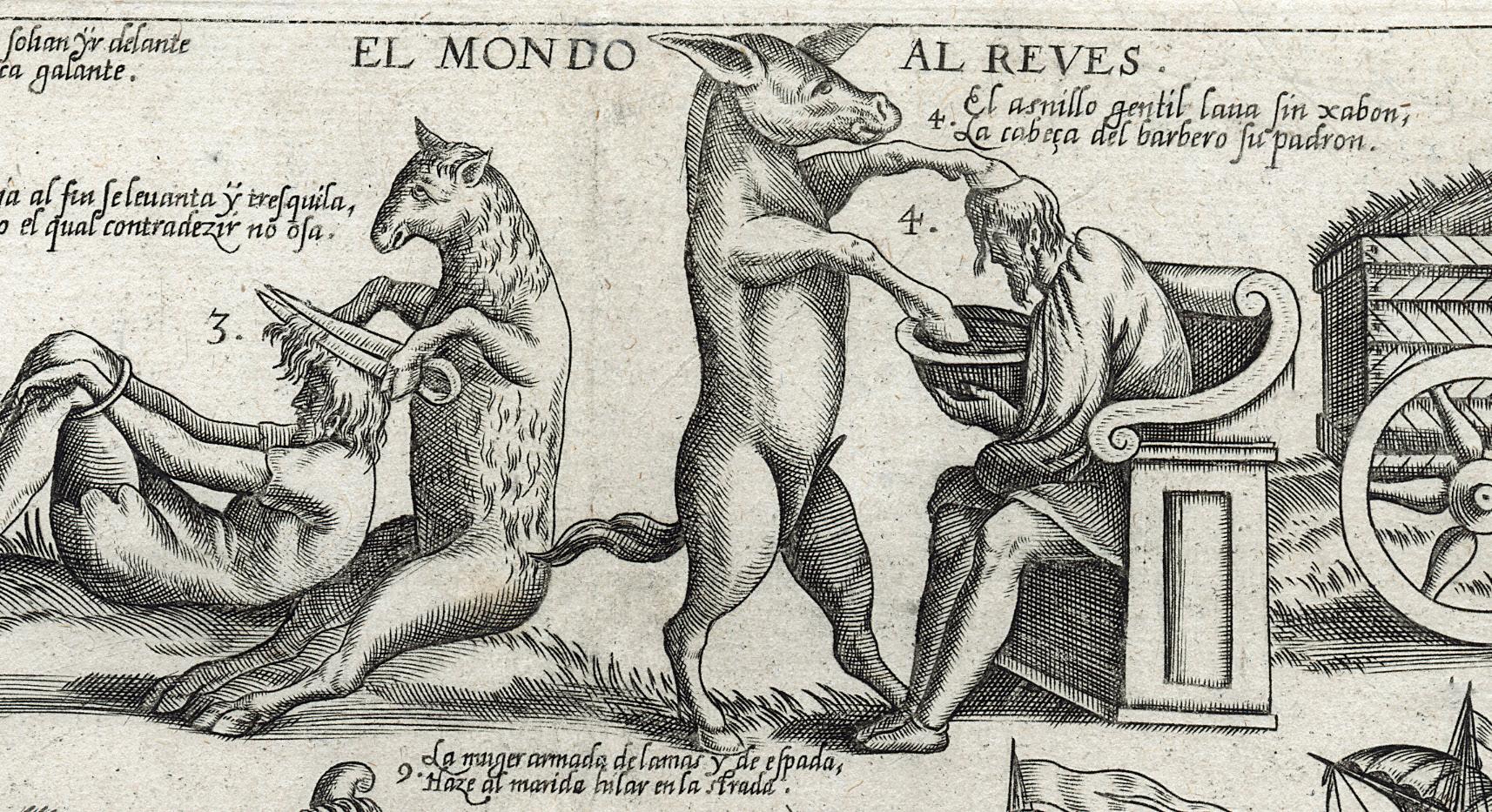 The World upside down is one of the most fascinating iconographic themes in the field of popular prints, a reflection of the ambiguity and ambivalence of the everyday world and its unreal opposite. The grotesque scenes – like for instance an ass washing man’s head then cutting his hair, fish in trees and feeding on birds in the sea, etc. – often suggest a sense of social transgression, in some iconic repertoires connected with the carnival events, in which for a few days another possible apparent world emerges, made of chaos and madness, at the end of which one returns to the true virtuality of social