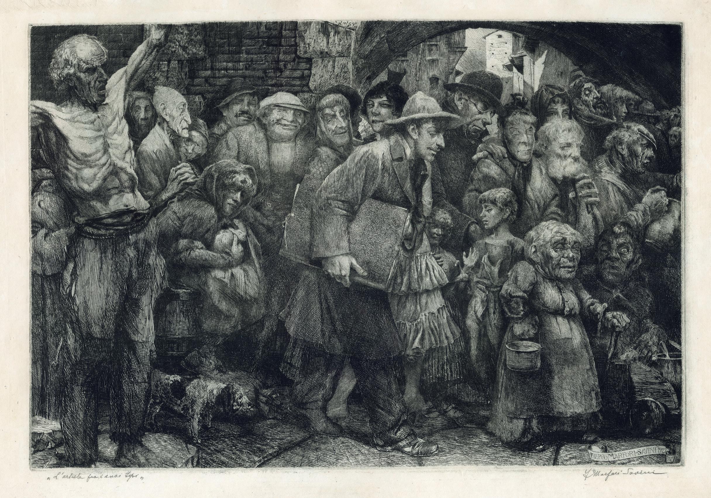 Signed lower right in pencil F Marfori Savini, and entitled lower left in pencil “L’Artista fra is suoi tipi” Plate 415 × 605 mm Provenance The artist’s studio (at least until 1949); Private collection, Italy