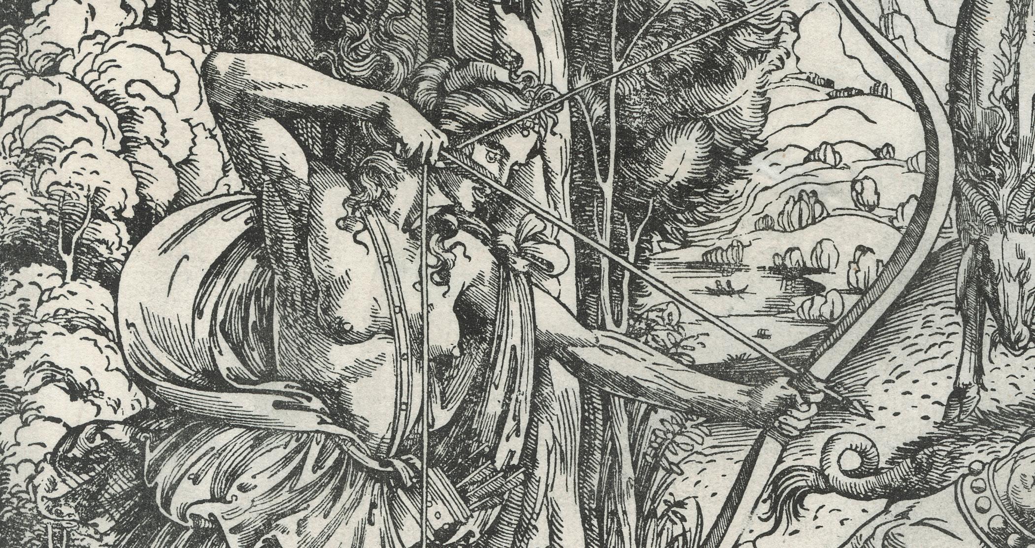 The scene indeed depicts the savage boar sent by Artemis to wreak havoc on Calydon after she had been ignored during the annual sacrifice. The bravest warriors were sent to hunt the boar; at the left the great huntress Atalanta was the first to draw blood with one of her arrows. In various states of dress, the figures encircle the wild beast, and it allows for dramatic exploration of the body in motion. Several influences on Palumba’s works have been proposed, but in this case one could say that the naked man at the far right recalls the same figure in Pollaiuolo’s engraving. Because the figures are presented to the viewer like a sculptural frieze, other sources have also been suggested. The horse in the print is indeed