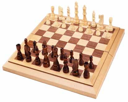 10 ½” x 10 ½” folding inlaid wood chess board with 1 ¼” sq. and 2 ½” king. PK 6 $15.00/$15.50 ea.