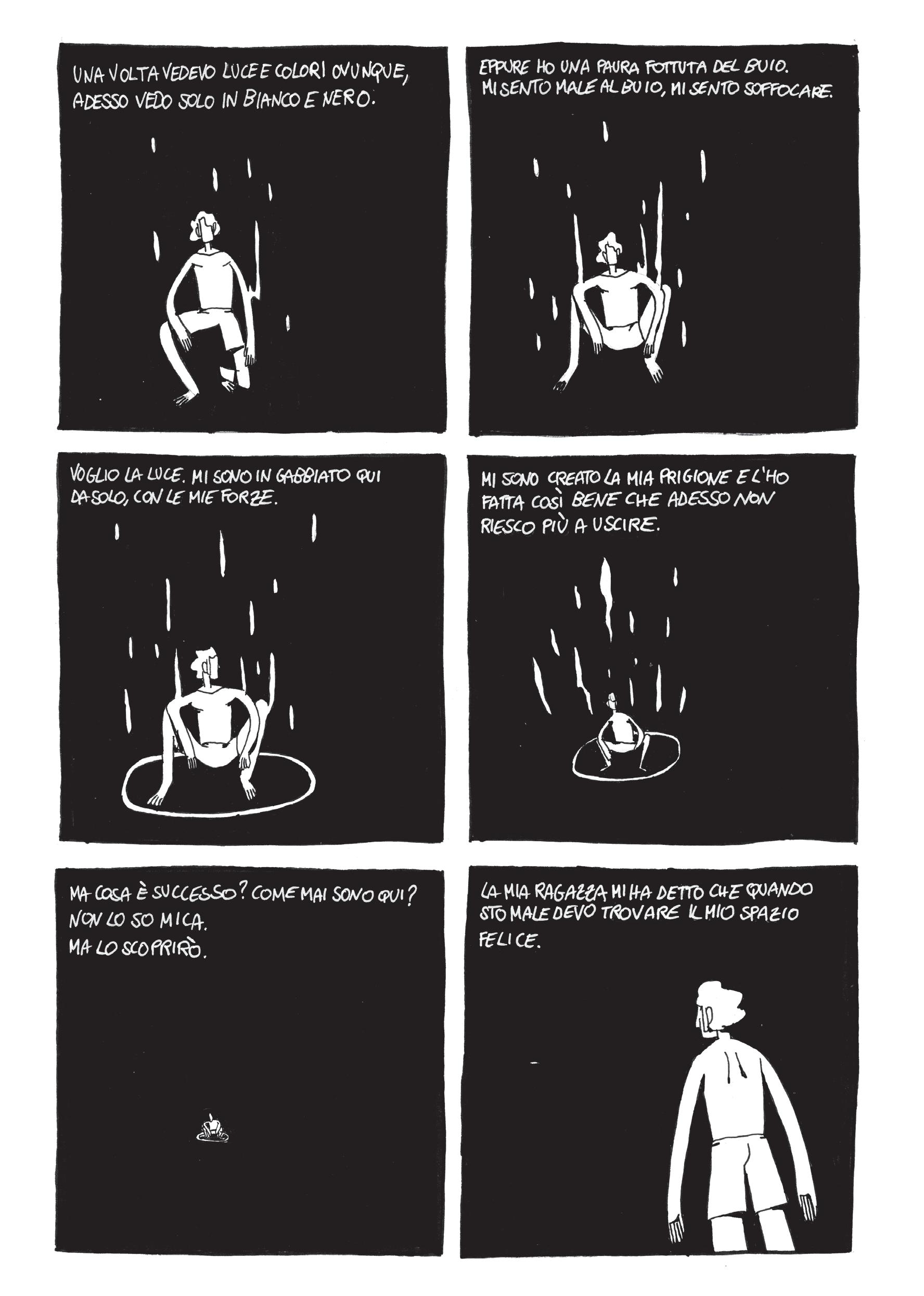 Cosa succede quando un fumettista come Adam Tempesta decide di raccontare, con il suo stile e il suo immaginario creativo, un periodo psicologicamente ed emotivamente difficile che ha vissuto? Nasce un graphic novel interamente ambientato nel suo spazio interiore, dove il buio, il nero, raccontano la difficoltà, la sofferenza, mentre il bianco è la luce, la serenità, lo spazio dove tutto è possibile, dove la creazione è gioia, divertimento, lo spazio aperto in cui stare bene.