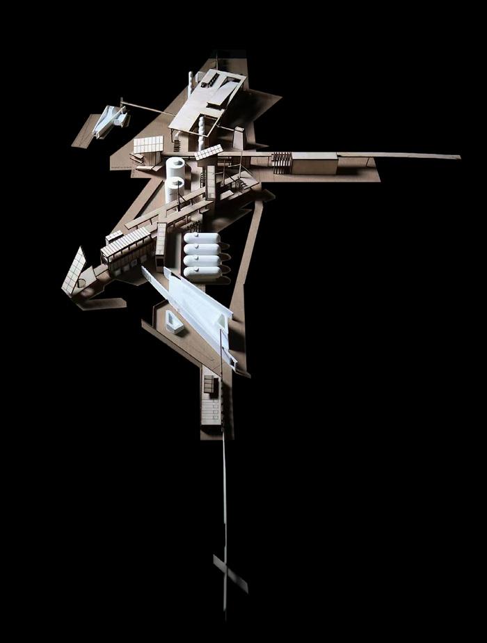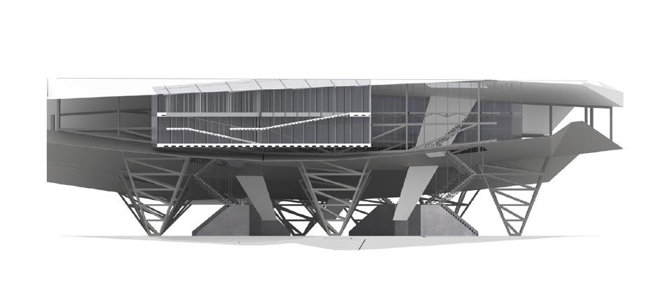 address the future settlement of the indigenous Guna community and the preservation of its memory. Esmeralda Lau has designed a drying facility and depot for local materials to support the construction of new floating houses, while Hong Yu imagines a new community anchored to the flooded site, whose civic infrastructures reflect the settlement pattern on the coral island below. Bryce Liang takes another approach, designing a new cultural facility and temporary residence for the Guna on the waterfront of Colón, the city at the Atlantic entrance to the canal. National water politics are brought into focus in Georgina Stewart-Fleming’s ‘Water Council’ project. Near the heritage site Panamá Viejo in Panamá City, this takes the form of a delicate inhabited urban-scale roof that shelters the ground below. Noa Barak’s design tackles water pollution in the tidal basin of Boca La Caja, providing facilities and a new civic hub for this informal fishing community located at the foot of the city’s financial district. Sean Alavazo crosses instrumental and symbolic programmes, with a project of flood retention that also acts as an enigmatic cathedral for the collective observances of Afro-Panamanian religions.
