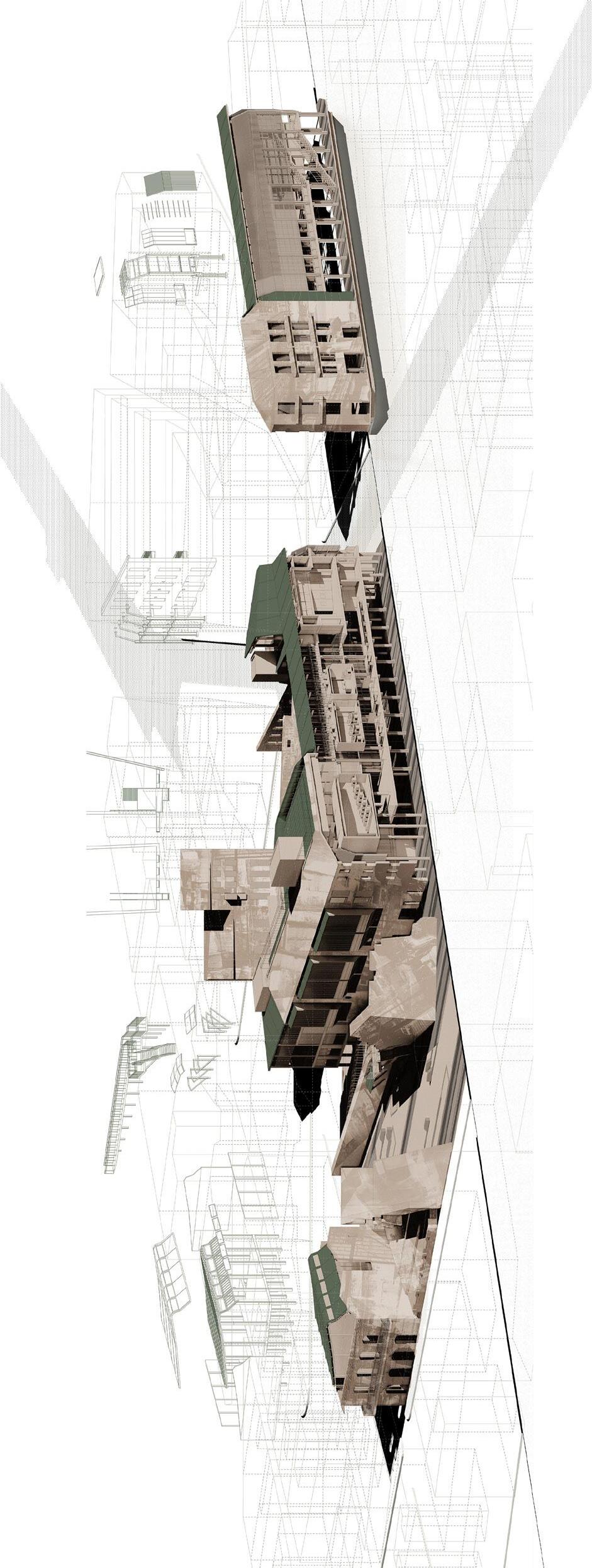 The incorporation of social and urban networks with infrastructural agroeconomies forms the proposal; a new heart of food culture within the ports of Old Panamá City. The programme is envisioned as an expanding kitchen, incorporating the food cycle onto its site through a series of infrastructural and landscaped plazas. The first of these is an open pantry and kitchen, drawing produce from its urban neighbours to respond to food poverty via [re]provision. The second is food distribution and production, using borrowed harvest from the city to [re]configure the urban dining experience: a social and communal dining hall. Finally, a composting and energy plant that recycles urban food waste and rainwater. These outputs [re]form themselves into spaces of food growth and production, creating a new public plaza for the district and completing a food cycle, resulting in a proposal that is entirely self-sufficient. The programme blends openair and sheltered spaces through a series of nested infrastructural ‘vessels’ that connect through purpose-led landscaping. Two large roofs form volumetrically heavy architectural forms while maintaining lightness and communal gathering spaces through integration of market stalls, dining areas, and urban gardens. The nested, scalable programmes, imagined as human-scaled habitats of care, aim to raise awareness of food waste, food recycling and food provision. They revitalise the heart of food culture by creating spaces that hope to foster conversation, friendship, and autonomy; proposing the sharing of food as a tool to enhance Panamá’s identity as a crossroads of culture, ecology, and society.