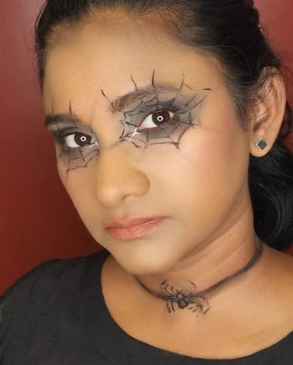 @uma_makeoverartist has created a unique eye look by taking the classic smoky eyeshadow and making it more appropriate for Halloween. She gave herself a light smoky eye and went over it with black eyeliner creaking a spider wed pattern on both eyes