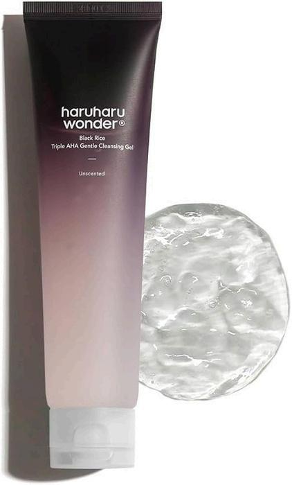 The HaruHaru Wonder Black Rice AHA Triple Hyaluronic Gentle Cleansing Gel offers a unique blend of cleansing and exfoliation. Infused with antioxidant-rich fermented black rice extract, it protects and rejuvenates the skin. The AHA complex gently exfoliates dead skin cells, improving texture and brightness, while triple hyaluronic acid provides deep hydration and plumps the skin. This gentle formula, which includes betaine and glycerin, cleanses effectively without stripping natural oils, making it ideal f or daily use on all skin types.