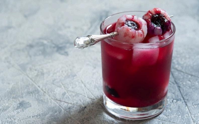 Drain the lychees and cocktail cherries, reserving the juices in a jug. Push a raisin into one end of each cherry, then push the cherries into the lychees to make ‘eyeballs’.