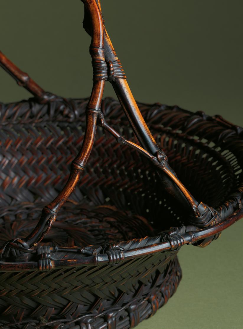 Madake and nemagaridake bamboo , susudake (smoked bamboo) and rattan; twill plaiting, radial plaiting, knotting, bent natural bamboo handle