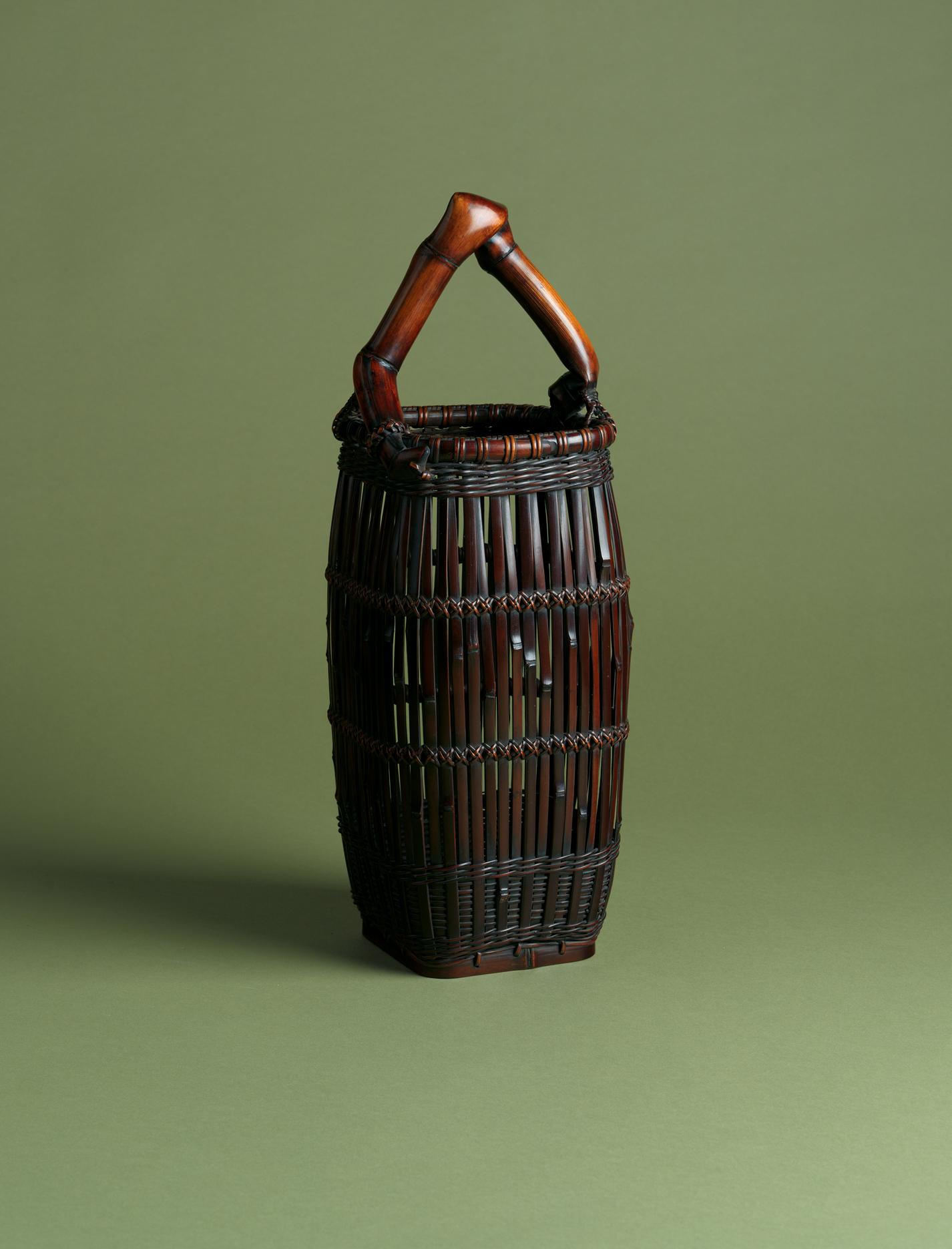 Madake and nemagaridake ( hōbichiku ) bamboo, rattan and lacquer; twined square plaiting overlaid on diagonal plaiting, knotting, bamboo-root handle