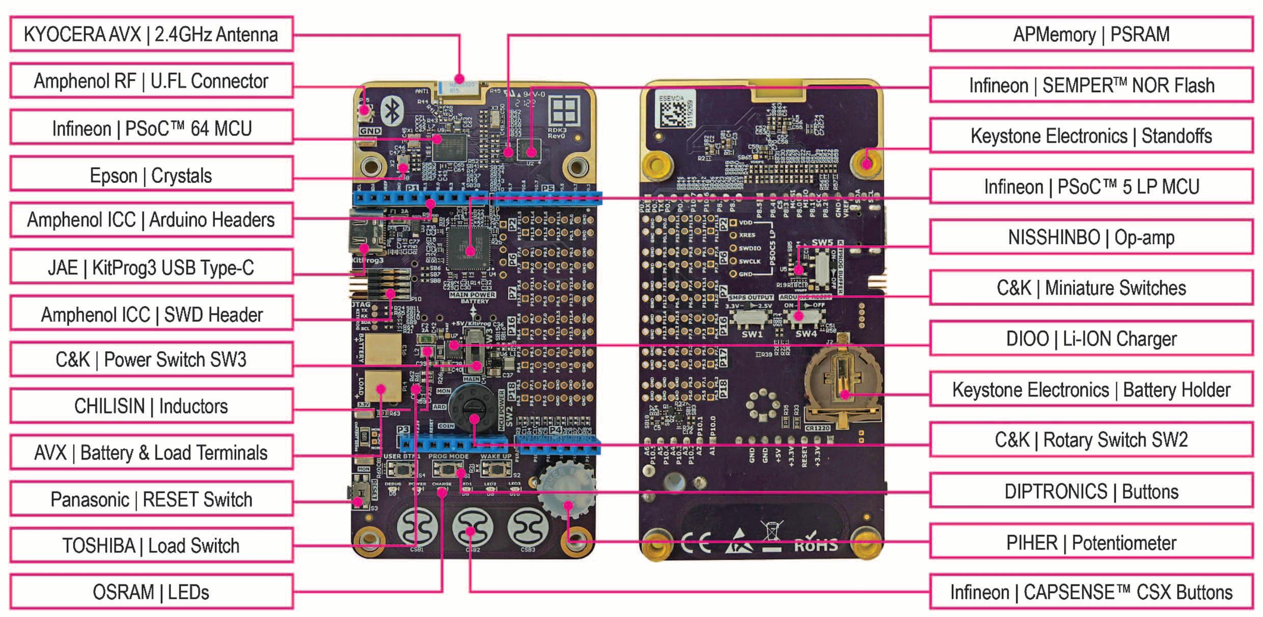 Microcontrolerul PSoC 64TM de la Infineon este componenta principală a plăcii de bază, permițând implementarea unor caracteristici de securitate de ultimă generație. Variabilitatea facilitează, de asemenea, integrarea software-ului Rutronik System Solutions în ModusToolboxTM de la Infineon.