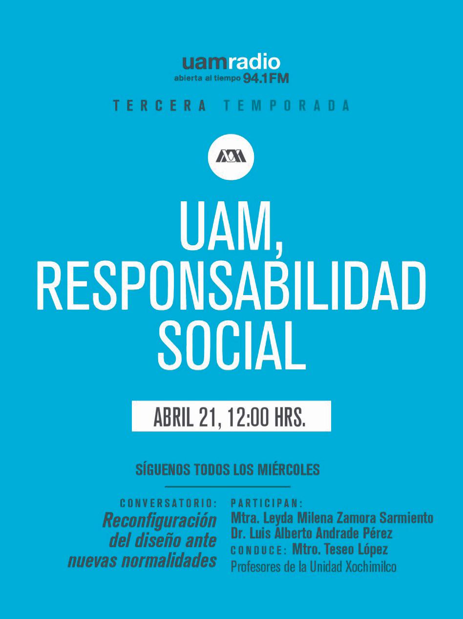 En tiempos de pandemia se ha experimentado una incertidumbre de lo que sucederá al regresar a una “nueva normalidad”, y como es que la Universidad Autónoma Metropolitana hará frente a esta problemática. En ese sentido, se llevó a cabo un conversatorio llamado “Reconfiguración del diseño ante nuevas normalidades”, el cual se transmitió a través de UAM-Radio 94.1 FM, dirigido por Carlos Urbano Gamiz. Estuvieron presentes, como conductor, el maestro Teseo López Vargas (coordinador de la Licenciatura en Comunicación Social), la maestra Leyda Milena Zamora Sarmiento y el doctor Luis Alberto Andrade Pérez, profesores investigadores en la Universidad Autónoma Metropolitana, Unidad Xochimilco.