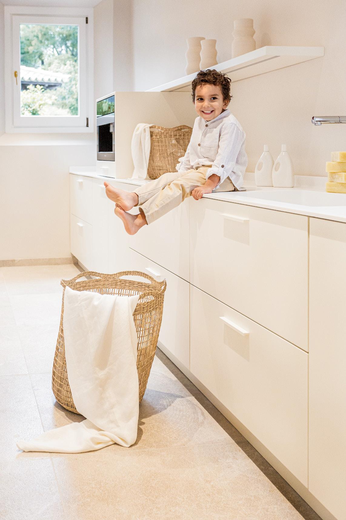 Además de la cocina principal, esta casa cuenta con una coladuría blanca y pulcra, donde los muebles lacados en White Off y la encimera de Corian se combinan en una elegancia minimalista que complementa a la perfección el resto de la vivienda.