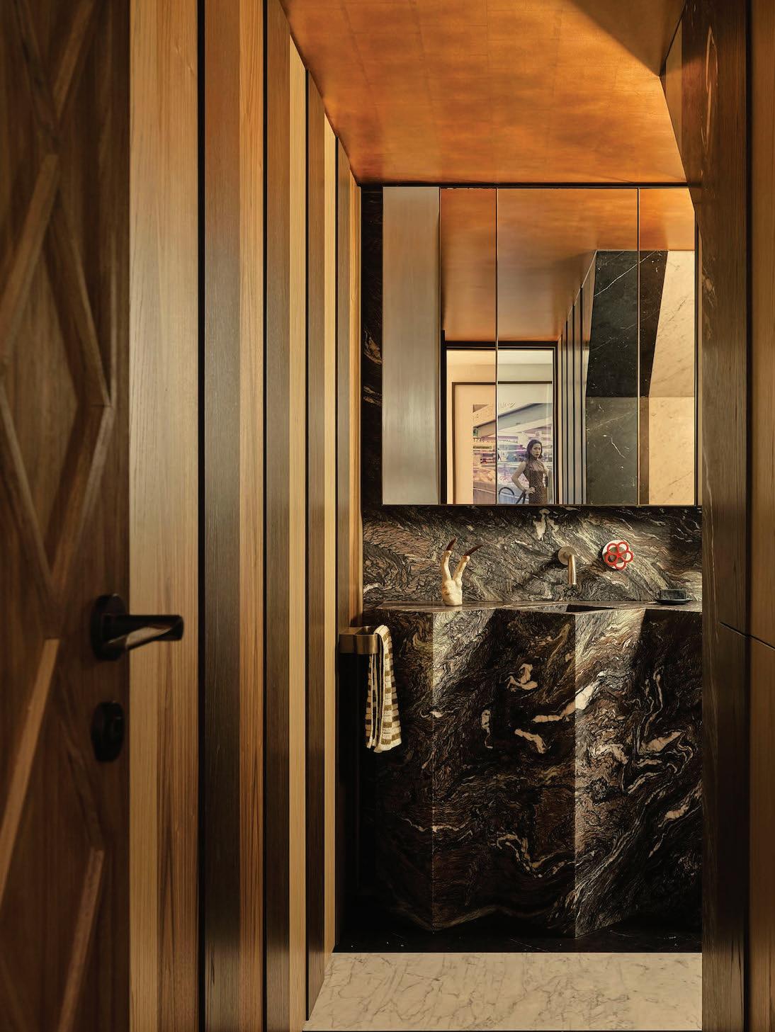 The material palette in the bathrooms feels both restrained and richly layered. Can you share more about the finishes
