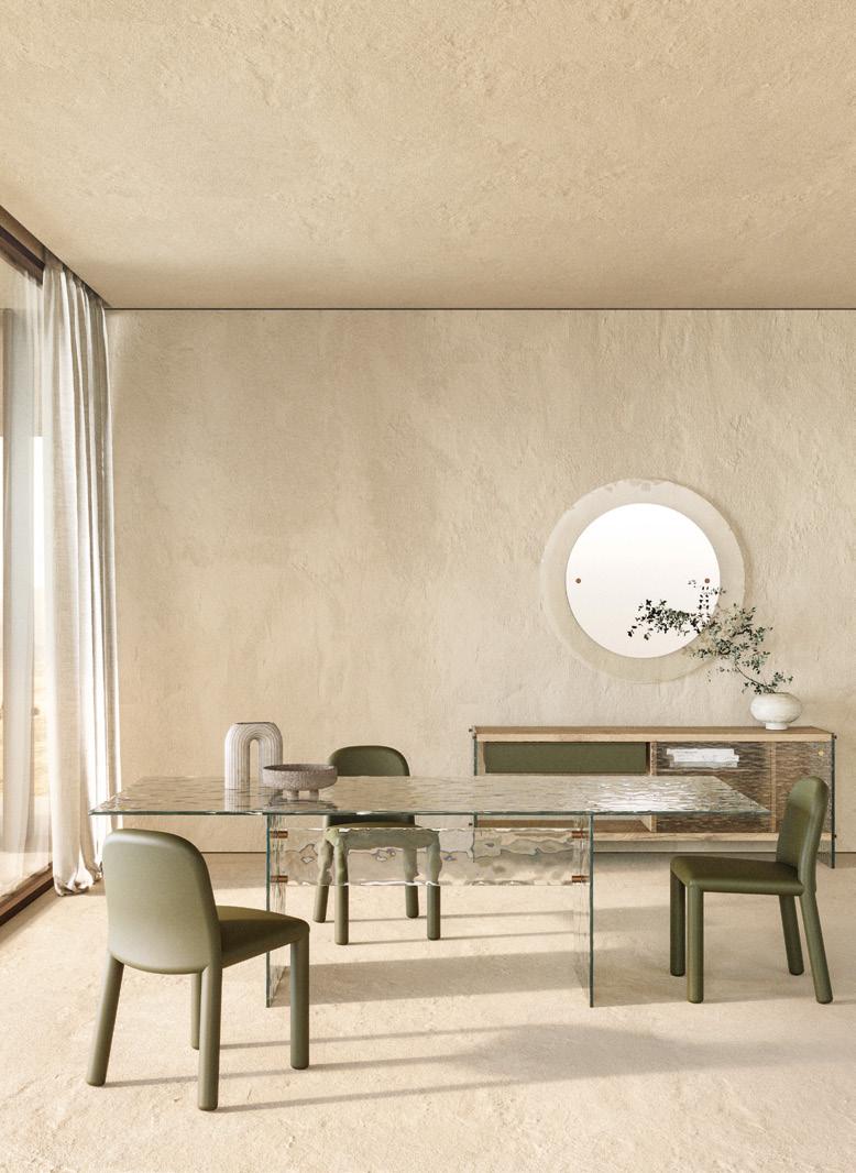 Las formas se vuelven esenciales en extremo, dado que el papel del diseño es dejar aflorar las vibraciones sensoriales de la materia. Esta pureza de formas regresa en la mesa Waterfall, realizada íntegramente en vidrio, celebra la transparencia y la ligereza del material. La poesía del material también reinventa una pieza clásica: la vitrina River, moderna y atemporal, combina madera recuperada, vidrio y cuero. La conexión entre los espacios domésticos y el hogar que caracteriza todo el trabajo de Naturedesign también es evidente en la mesa Lymph, cuya superficie sinuosa y orgánica evoca formas biomórficas para introducir un nuevo concepto de convivencia. ·