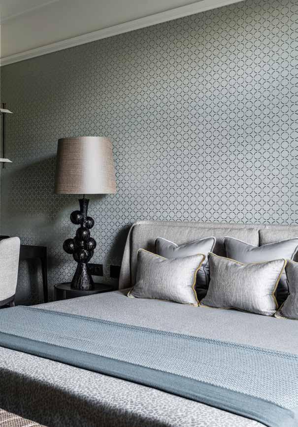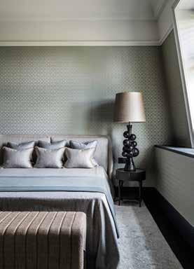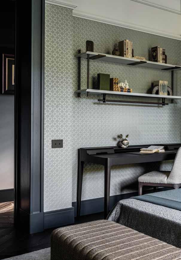 El ambiente sereno, tranquilo y al mismo tiempo refrescante de esta habitación se debe principalmente a los tonos verde claro y a los revestimientos de paredes con motivos dorados. Una tercera alfombra agrega textura y calidez al espacio. Dado que la mayor parte de la habitación estaba ocupada por una gran cama doble y una otomana contemporánea, el estudio encontró una solución elegante al desafío espacial al introducir un área de estudio hecha a medida con un escritorio y estantes.