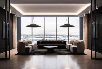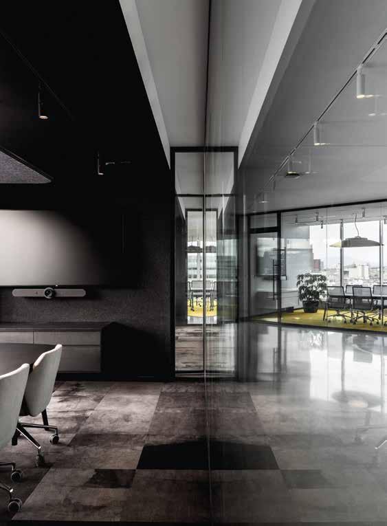 El resto de los espacios están diseñados en un estilo purista en blanco y negro, asegurando así la atemporalidad y elegancia de los espacios, y dejando mucho lugar al espectáculo urbano que ofrecen las abundantes ventanas. La visión se consolida a través de la elección de materiales y muebles, expresando prestigio y refinamiento. Volúmenes cúbicos en blanco o negro dividen el vasto interior para crear subespacios, estableciendo una clara demarcación en las áreas de trabajo.