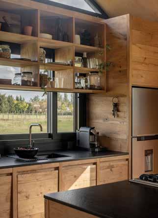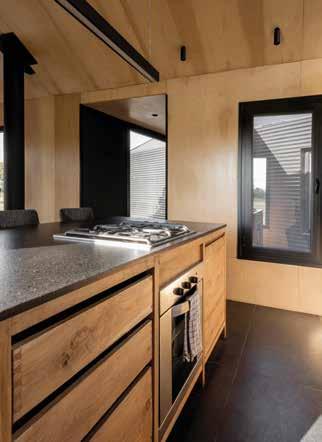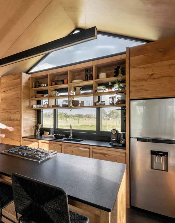 La cocina amplia y luminosa cuenta con gabinetes ocultos, que mantienen la simetría y crean un espacio claro y sereno. La pieza central es una isla de cocina hecha de piedra en bruto con una mesada de lava volcánica azul. La base gris de la isla de la cocina combina armoniosamente con la piedra utilizada para la chimenea.