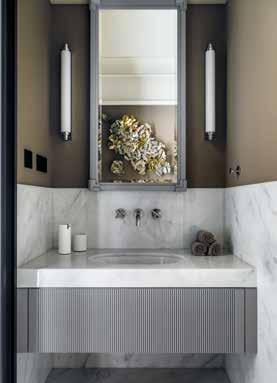 Para el dormitorio principal el estudio optó por un enfoque más clásico. Incorporaron puertas tradicionales, paneles de madera y molduras de yeso para ocultar las rejillas de ventilación. La paleta de colores combina sutilmente tonos azul marino oscuro y detalles dorados, creando una atmósfera de refinada elegancia. La habitación cuenta con un vestidor privado independiente y un lujoso baño en el que predominan los tonos azul marino y gris piedra.