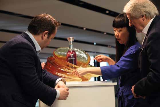 Solo se fabricaron tres decantadores y dos esculturas de The Rare, un Single Malt de 49 años de The Dalmore, alojado en una dinámica escultura de vidrio de color ámbar diseñada por Leung y su equipo en Zaha Hadid Architects.