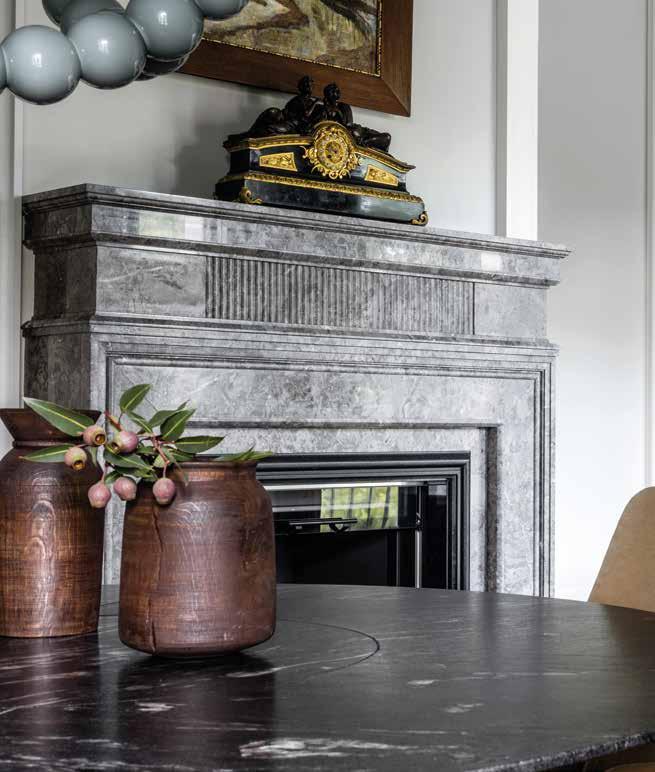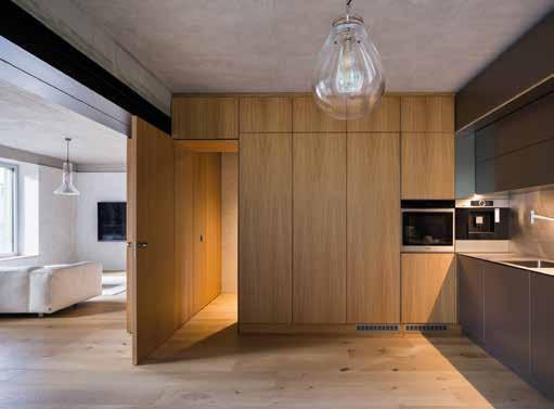El pasillo conduce a la sala de estar de planta abierta, que incluye la cocina y el comedor. Todo el espacio está lleno de luz natural que entra a través de los grandes ventanales de piso a techo. La sensación contemporánea del espacio se complementa magníficamente con las contraventanas de madera, que son otro punto destacado que refleja el carácter histórico del edificio. Dada la intrincada geometría del área abierta, el equipo de diseño optó por la simplicidad en el tratamiento de las paredes: superficies lisas, líneas rectas y una paleta de color gris claro neutro son el telón de fondo ideal para la colección de obras de arte de los propietarios, la mayoría de las cuales están expuestas en opulentos marcos clásicos.
