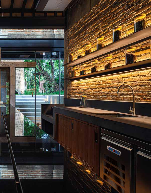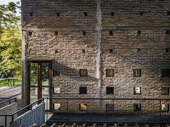 Para el cobertizo de té, el ruinoso granero fue remodelado con ladrillos reutilizados y un perfil mínimo de inserción de acero, que sirve para uso público y sombra. El nuevo espacio hundido y las paredes de vidrio abiertas dan la bienvenida a la conexión horizontal con los programas circundantes y la experiencia cercana a la naturaleza, al tiempo que resaltan el ambiente vertical inmersivo para beber té. Se agregó un muro de contención y piso de grava para el manejo del agua, y se recuperó la madera para los muebles. Los diseños de iluminación ocultos que brillan en la oscuridad recuerdan a los tradicionales secaderos.