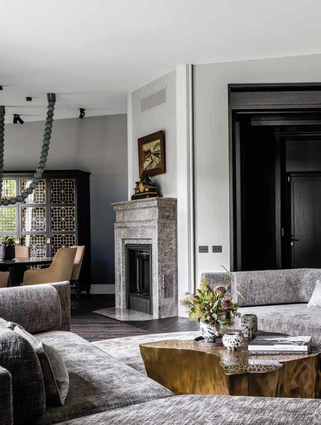 Para realzar el ambiente clásico, el equipo de diseño incorporó una impresionante chimenea de leña. Un mueble de cocina hecho a medida al estilo de la Rusia imperial añade un toque de nostalgia. Parece como si una preciosa reliquia familiar, transmitida y amada durante generaciones, hubiera encontrado ahora su hogar junto a una instalación de iluminación ultra moderna, hecha a medida para el proyecto. El contraste entre la lámpara con collar de cuentas de gran tamaño y el mueble alto no solo es intrigante sino también una mezcla perfecta de estilo pasado y presente. El grupo de sofás recuerda a los monumentales terraplenes de granito que bordean el río Neva. La zona de asientos está unida por la alfombra hecha a medida, que añade tranquilidad y encanto a la sala de estar de espacio abierto.