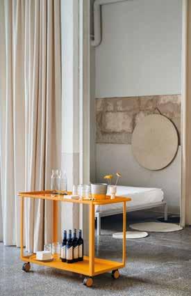 La arquitecta eligió muebles de la marca italiana Fantin, ideales para la definición funcional del espacio: dos mesas Frame en gris claro, cuyo generoso tamaño las hace idóneas para acoger conversaciones y diálogos, una cama Frame, oculta a la vista por una cortina, un carro Run y una Frame Kitchen en verde bosque en el patio. La zona de oficina está bien definida gracias a un Frame Sideboard y un escritorio Still, elegidos en los tonos azul acero, y la estantería Uno, en blanco con ganchos en contraste color amarillo melón.