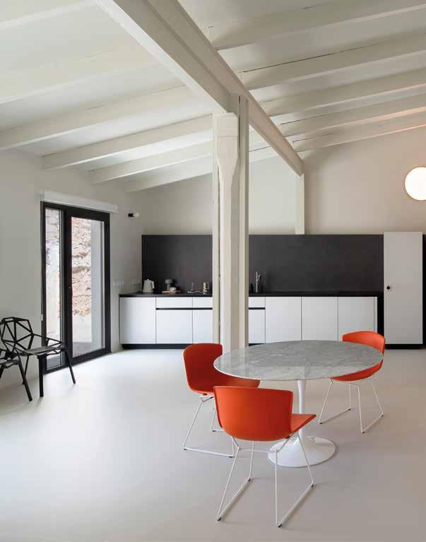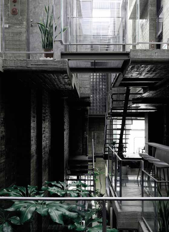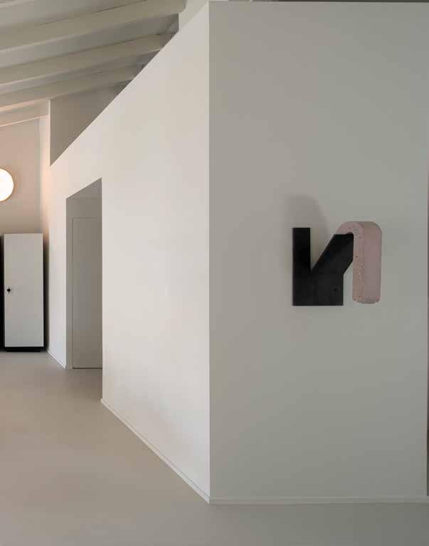 Objeto de una renovación llevada a cabo por la arquitecta Chiara Ferrari, asistida para la parte estructural por el estudio local AR3 arquitectos, el edificio mantiene deliberadamente su carácter industrial, compuesto por espacios amplios y techos altos con vigas visibles, pisos de la terraza originales de los años 30 que han sido restaurados, cemento crudo y bloques de piedra en bruto, intencionalmente visibles. En cuanto al color, la diseñadora optó por un blanco general que dialoga bien con la estructura y con los pocos toques puros de color, principalmente de tonos neutros grises y algunos toques más vibrantes, como el azul, el rojo y el naranja de algunos muebles seleccionados y elementos hechos a medida.