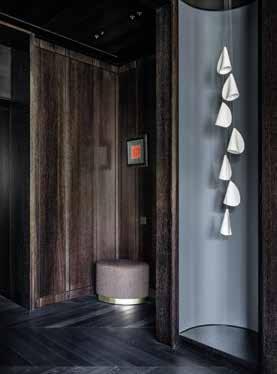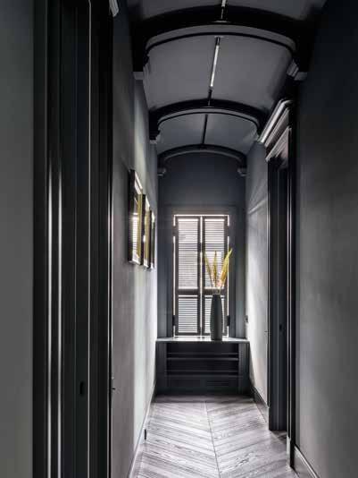 El vestíbulo en tonos oscuros otorga al ingresar una impresión sorprendente. La característica principal de este espacio son las hornacinas semi cilíndricas que, enmarcadas con madera oscura, albergan impresionantes instalaciones de iluminación, hechas de porcelana. Estos nichos funcionan en perfecta armonía con la geometría del techo abovedado del pasillo que conduce a la parte privada del departamento donde se encuentran los dormitorios. Los pisos de roble francés se extienden por todo el departamento, agregando calidez natural al espacio y proyectando una sensación del carácter histórico del edificio en el interior. El suelo combina perfectamente con los marcos de puertas de madera diseñados a medida por el estudio.