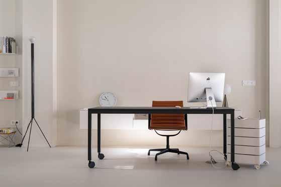 En la primera planta, en el "108", el mismo minimalismo de la composición de la planta baja se observa en la casa/estudio de la arquitecta, donde se encuentran algunos de los elementos presentes en la planta inferior, como el escritorio Still para la zona de trabajo, también en azul acero, y una mesa Still blanca, elegida esta vez en forma rectangular y alargada que permite acoger a varios comensales y a la vez convertirse en punto de reuniones y trabajo, siguiendo con la fluidez explícita de los espacios y las funciones.•