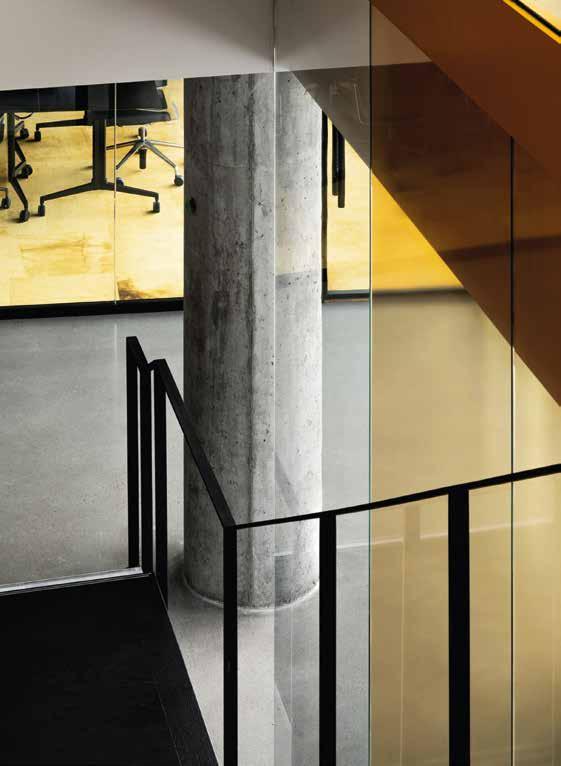 La conexión vertical entre los pisos se establece a través de una monumental escalera arquitectónica, encerrada en un cubo de vidrio amarillo, que une los tres niveles del espacio público. Además de crear una apertura visual y física en los tres niveles, la escalera se ubica en el centro del proyecto como un elemento visual fuerte, particularmente por su color vibrante, uno de los pocos puntos de color en el proyecto. Con reminiscencias de las farolas de la ciudad y sus reflejos al anochecer, el amarillo introduce un toque dinámico pero atemporal al espacio.