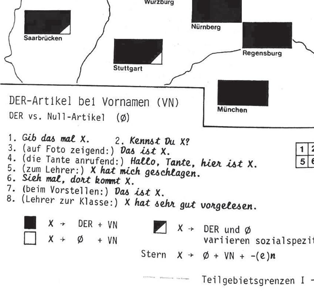Die Verwendung des Artikels variiert regional: Im Norden wird er in negativen Kontexten genutzt, im Süden hingegen konsequent vor Vornamen. Im mitteldeutschem Raum ist die Verwendung häufiger, aber weniger strikt. Im Nominativ wird der Artikel häufiger verwendet, besonders bei Bezugnahme auf Dritte. Bei Selbstnennung und Anwesenheit entfällt er meist. Diese regionalen Unterschiede sind fester Bestandteil der Namenskonstruktion (vgl. Bellmann 1990, S. 253–282; Ackermann 2018, S. 30 f.).