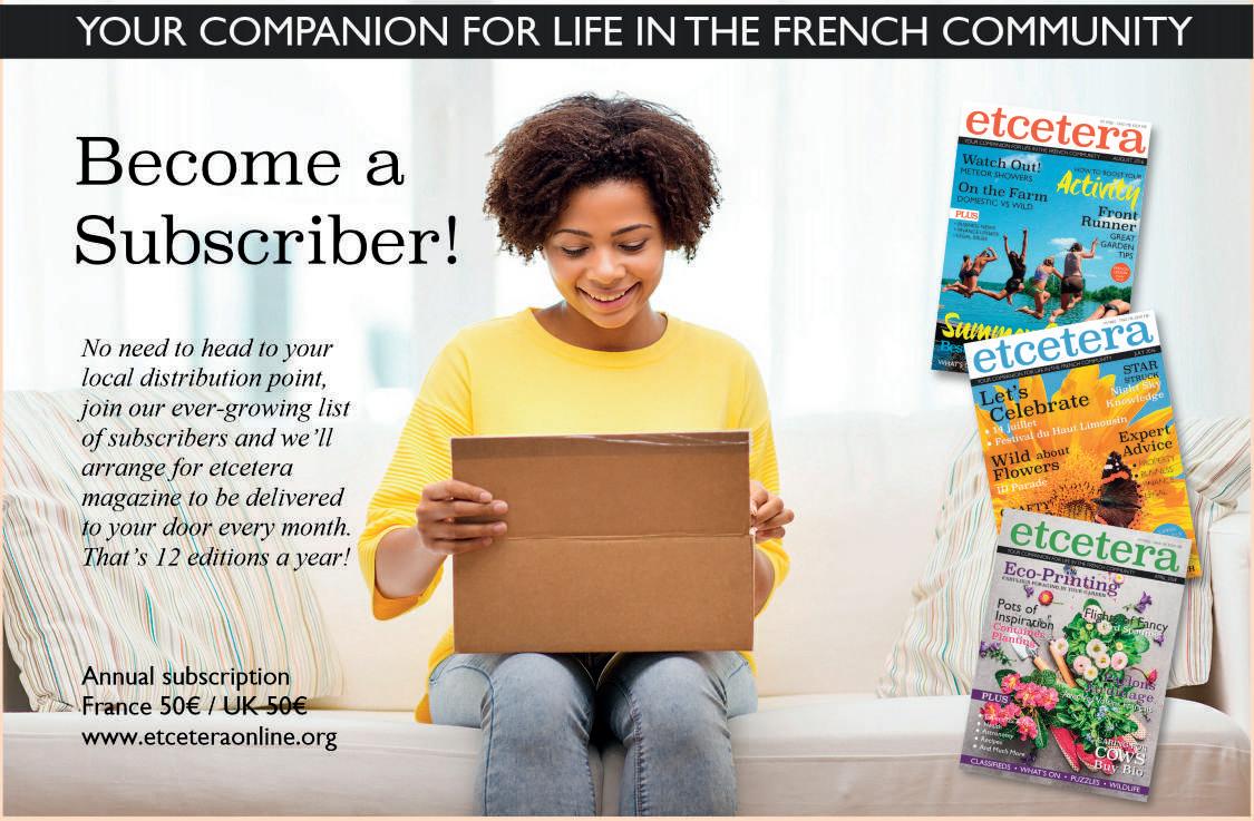 Code APE 5814Z Edition de Revues et Periodique Siret 80903463000016. La Présidente G. Feasey Registered. Le Bourg, 87360 Verneuil Moustiers. Impression: Rotimpres. Pol. Ind Casa Nova. Carrer Pla de l’Estany s/n. 17181 Aiguaviva (Girona) Espagne. etcetera est gratuit.