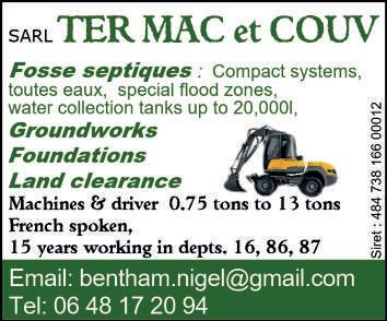 Interior & exterior tiling Travertine, marble, cement Ceramic, porcelain, mosaics Paul Hill (EI) 05 45 24 01 45 hilltoptiling@hotmail.co.uk siret no 523 998 557 00020 hilltoptiling Steve’s property maintenance ALL TYPES OF ROOFING, RENOVATIONS, CONVERSIONS, PLASTERING, STUD WALLS, MAINTENANCE AND REPAIRS T. 05 55 50 52 02 E: lowe.steven@orange.fr Siret 84223310800013 FULLY INSURED PLANT: Diggers 2.2 and 3 tonne / Dumpers Plant Trailer / Roller. TOOLS: Whacker Plate / Electric Breaker / Grinders / Drills Rotovator plus much more - see website www.davesdiggers.com Email: davesplanthire@gmail.com Tel. 06 75 18 09 13 PLANT & TOOL HIRE / MAN & TIPPER siret 5250162590026 Based 79120 Covering 79, 86, 16 & 87 AC Kitchens & Bathrooms Website: ackitchens.fr Email: antschapman1971@gmail.com 05 17 36 17 74 / Mobile: 06 40 08 08 81 Siret 834026437 00022 Specialist Fitter, over 15 years’ experience PLUMBING - CUSTOM WORKTOP FITTING - CARPENTRY TILING - WOOD & LAMINATE FLOORING - DESIGN SERVICE Freequotes Charente / Haute-Vienne / Vienne Full English Scaffolding Service Safe, secure, adaptable. Meets all safety regs. Covered by full public liability insurance. Delivered, erected, and dismantled Over 20 years’ experience. Free Quotes. M C SCAFFOLDING Siret: 80025145600011 Depts 16, 87, part 24, 17, 79 & 86 Day: 07 85 44 26 66 / Eve: 05 45 66 49 87 martin.clare6@gmail.com Siret 887 698 108 00016 HANDYMAN Over 35 years’ experience in professional property maintenance Fully Insured with clear police checks in UK and France Home Repairs - Refurbishments Small Plumbing & Carpentry Jobs Gîte Maintenance General Gardening Grass Cutting - Jet Washing (to name a few...) Steve Medd T. 06 33 50 34 63 amamultiservices86@gmail.com Based Vienne, Haute-Vienne, Charente borders Siret 94948964500018 etcetera 55 artisans WASTE REMOVAL MULTI SERVICES ~ CASH PAID FOR SCRAP ~ House/Barn Clearances - Pre & Post-sale Rubbish Removal / Déchetterie Runs Collections / Deliveries Call Will Whiting 06 74 21 47 71 www.facebook.com/willwhiting87 covering depts 87, 16, 19, 23 & 24 Siret 532 981 198 00015