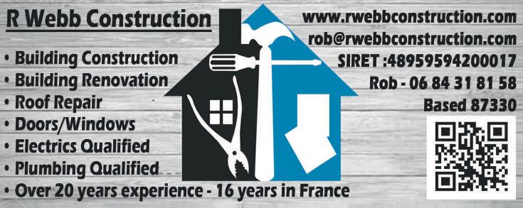etcetera 59 artisans Full English Scaffolding Service Safe, secure, adaptable. Meets all safety regs. Covered by full public liability insurance. Delivered, erected, and dismantled Over 20 years’ experience. Free Quotes. M C SCAFFOLDING Siret: 80025145600011 Depts 16, 87, part 24, 17, 79 & 86 Day: 07 85 44 26 66 / Eve: 05 45 66 49 87 martin.clare6@gmail.com One Builder Tout Batiment www.timhartley.fr Registered in France 2001 05 55 60 86 62 / 06 71 78 94 34 Siret 434972303RM87 tim_hartley@hotmail.com Lathus - Le Dorat - Bellac - La Souterraine Dompierre-les-Églises - Saint-Léger-Magnazeix - Magnac-Laval Steve’s property maintenance ALL TYPES OF ROOFING, RENOVATIONS, CONVERSIONS, PLASTERING, STUD WALLS, MAINTENANCE AND REPAIRS T. 05 55 50 52 02 E: lowe.steven@orange.fr Siret 84223310800013 FULLY INSURED Fully registered and insured Trading in France since 2007 Call Mark for a free quotation: T: 05 55 44 71 44 / M: 06 78 60 96 16 mumford.toiture@gmail.com Siret no. 493 159 412 00037